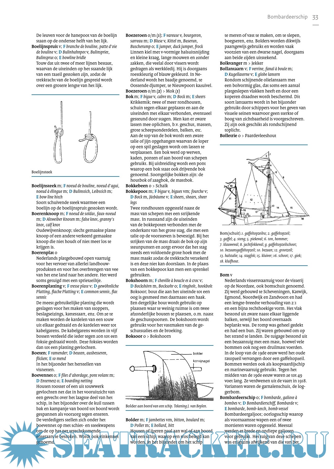 Specialized encyclopedia with approx. 7000 technical terms from shipping in general and sailing in particular. From Aak, Admiral and Anchor cushion to Grootbovenbramlijzeil, Kielhalen, Logboek and Zwolse kaag. Clearly printed in three columns