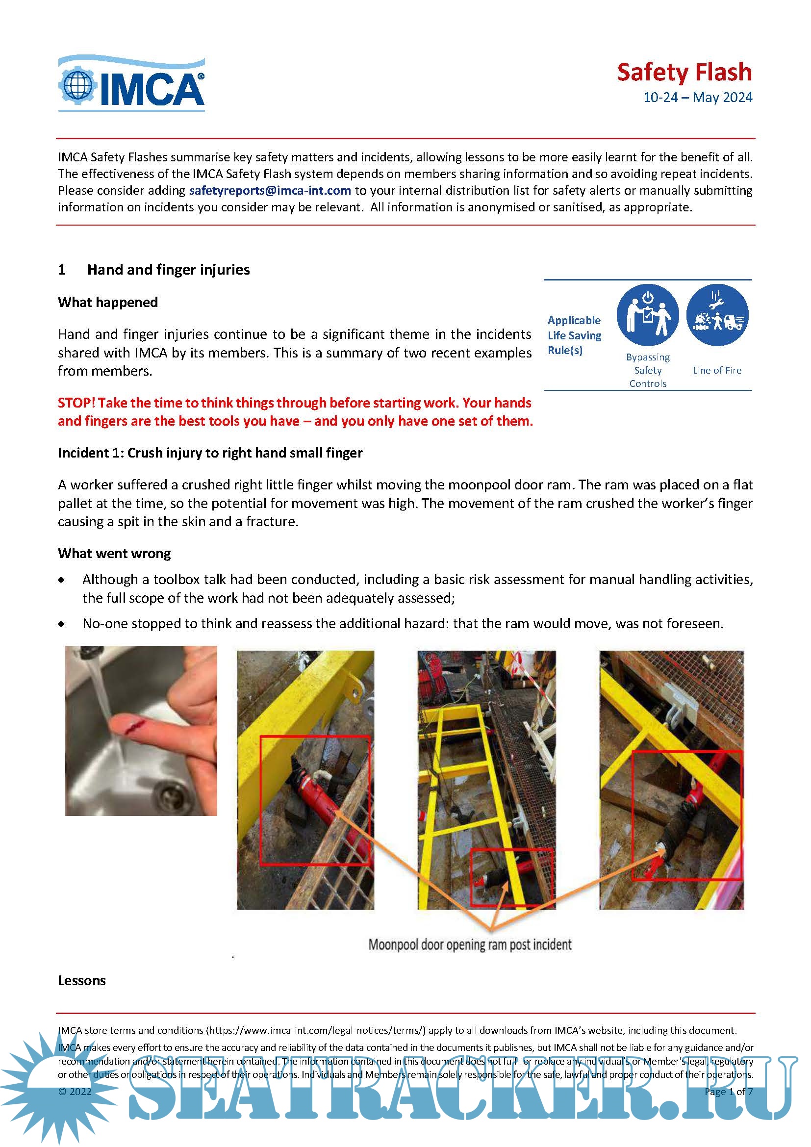 Description: The International Marine Contractors Association ( IMCA ) Safety Flashes disseminate important information on incidents and potential hazards and the lessons learnt from them that can help prevent incidents occurring elsewhere in the industry.