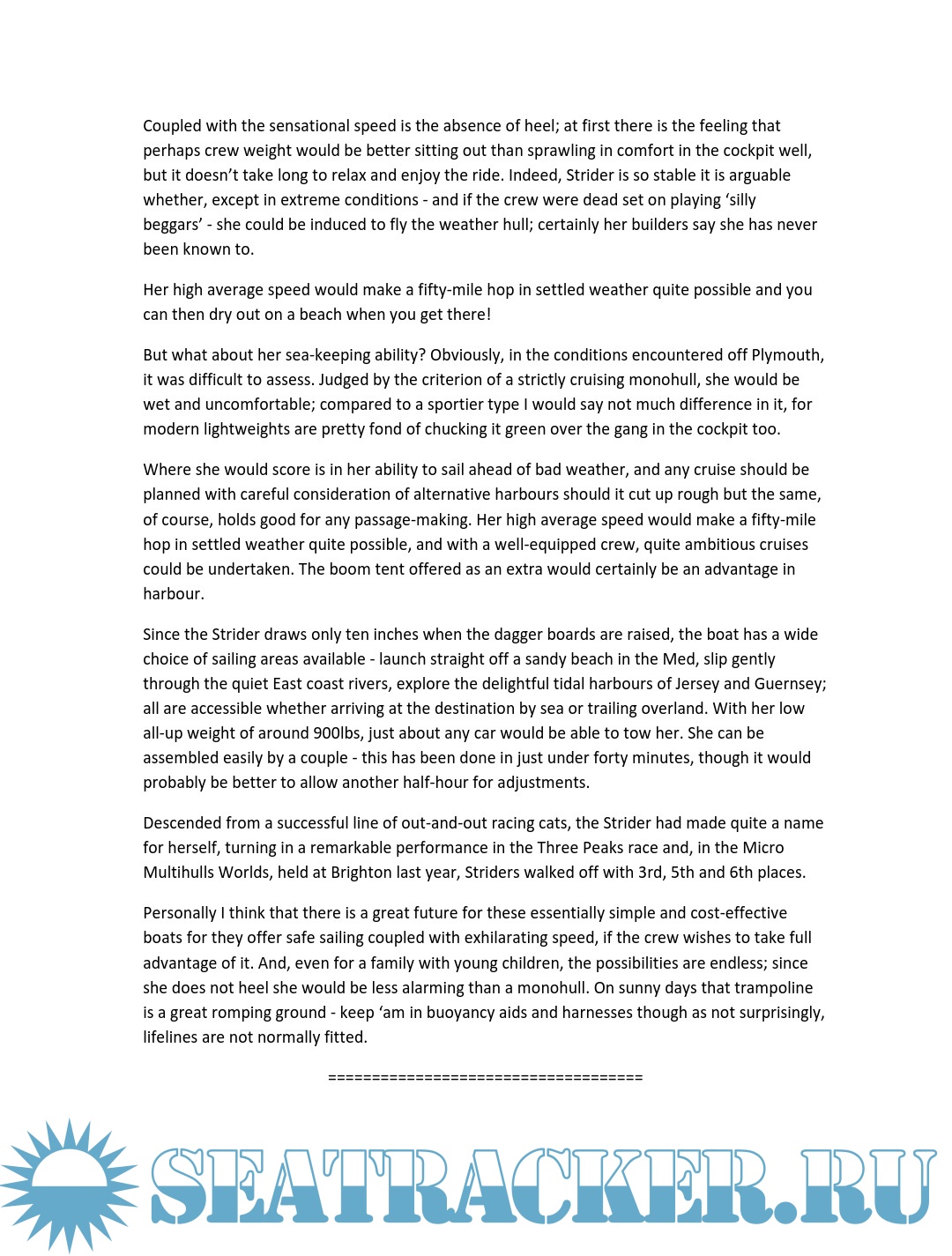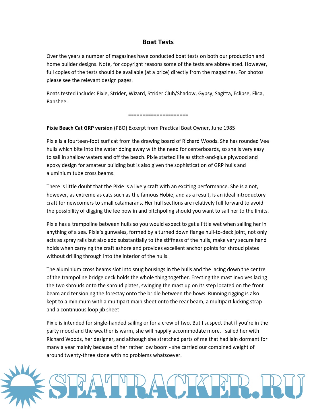 Year: - Language: English Author: - Genre: Technical Format: PDF Quality: eBook Pages count: 24 Description: Over the years a number of magazines have conducted boat tests on both our production and home builder designs. Note, for copyright reasons some of the tests are abbreviated. However, full copies of the tests should be available (at a price) directly from the magazines.