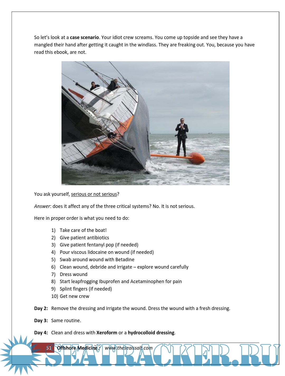 Year: 2012 Language: English Author: Hillen D. Genre: Manual Publisher: Derek Hillen Format: PDF Quality: eBook Pages count: 56 Description: This ebook is all about saving someone’s life offshore and maybe even your own. Most of us take off in boats knowing far more about the diesel engine than we do about the engine that is our own body. Using my case as an example; I was an Eagle Scout, took first aid courses in the past, did my CPR training etc., and I knew next to nothing. In an effort to eradicate some of my own ignorance on the subject I recently took a three-day wilderness medicine course offered by Wilderness Medical Associates International, which I highly recommend.