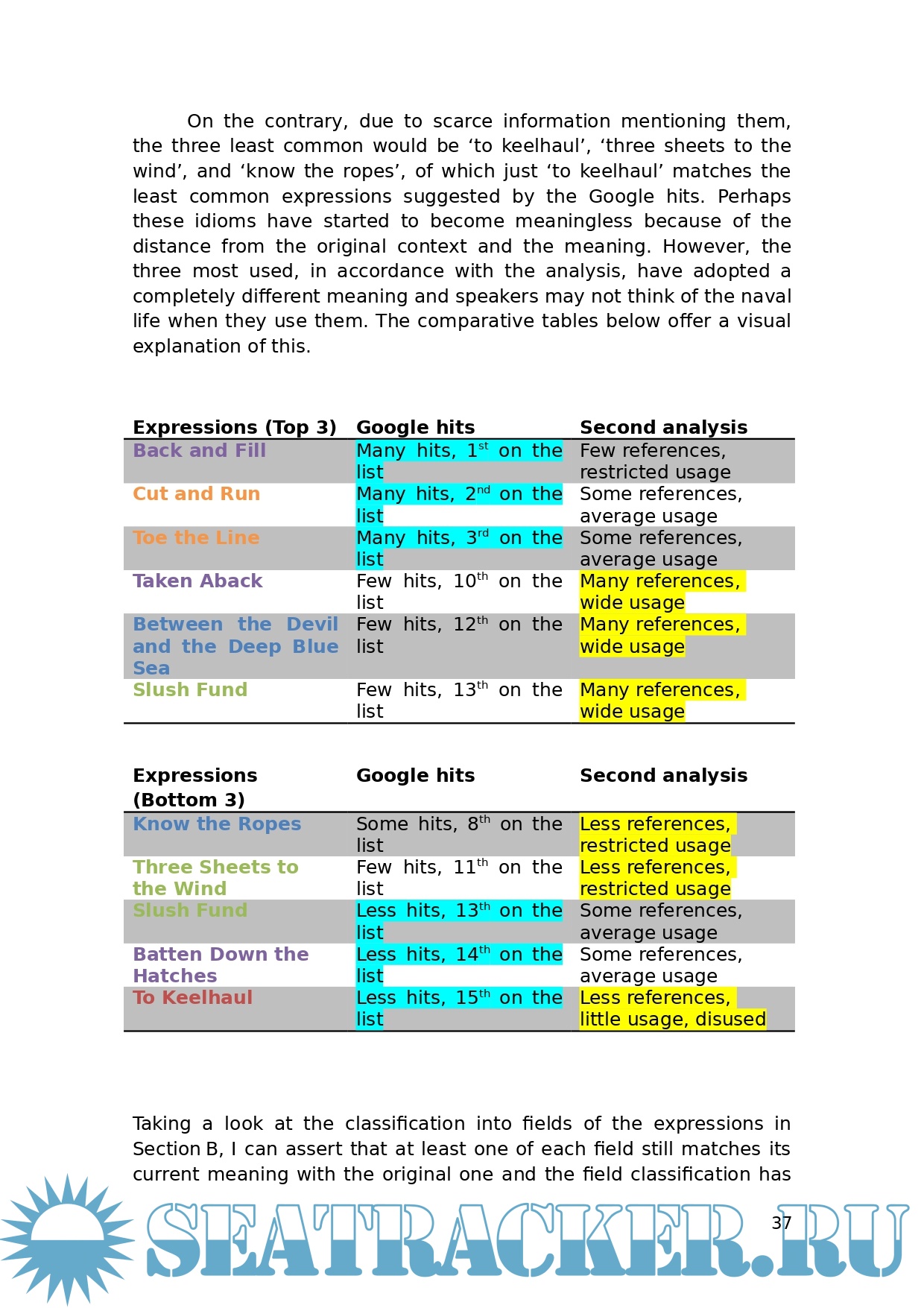 Description: This study analysed fifteen expressions of nautical origin, proved their current usage in written English and explained some possible processes that lead to their validity in everyday language. This was accomplished through linguistic analyses of the idioms and of examples in use, and through linguistic theory. The study consists of four sections which, in order of appearance, are a historical contextualisation, a study of the origin and the meaning of fifteen nautical expressions, an analysis of the terminology through real examples in everyday language, and a linguistic explanation of the processes of change in language. These analyses and explanations revealed that some terms of eighteenth-century nautical jargon are still in use in everyday written English, that some of these expressions are used in a wider range of registers than dictionaries state, and that one of the possible explanations for the language spread is ‘lexical diffusion’. This study also points to the possibility that some of the expressions under study might fall into disuse and suggested further research on the nautical influence in everyday spoken English.