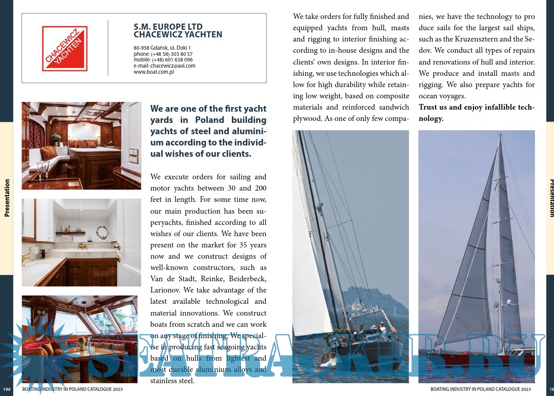 Year: 2023 Language: English Author: POLBOAT Genre: Catalog Publisher: POLBOAT Format: PDF Quality: eBook Pages count: 140 Description: Polish marine industry is more than just yacht yards and includes a highly developed network of producers of components and parts, as well as suppliers of production and maintenance materials for boats and yachts. The superb quality of the services allowed many of our suppliers like Kotniz, Sail Service, Pacyfic and many others to establish lasting cooperation with leading producers of yachts all over the world.