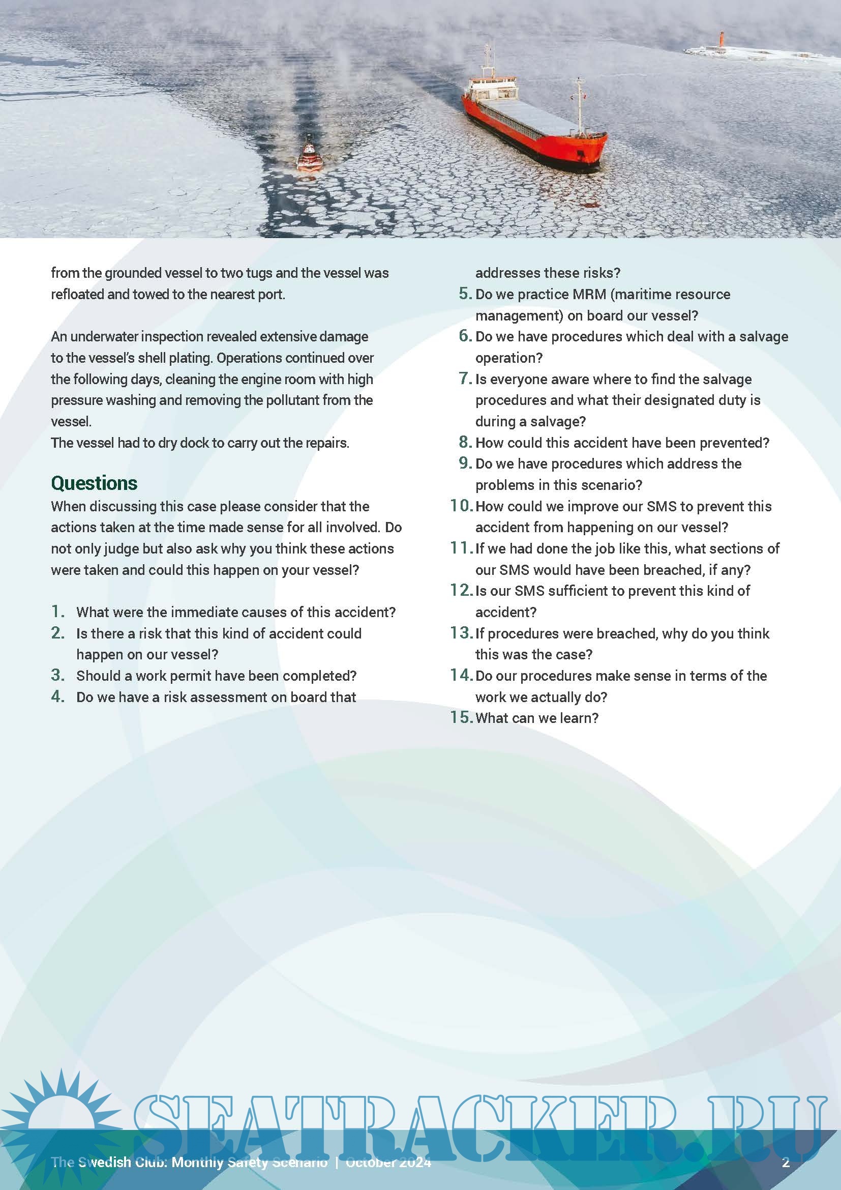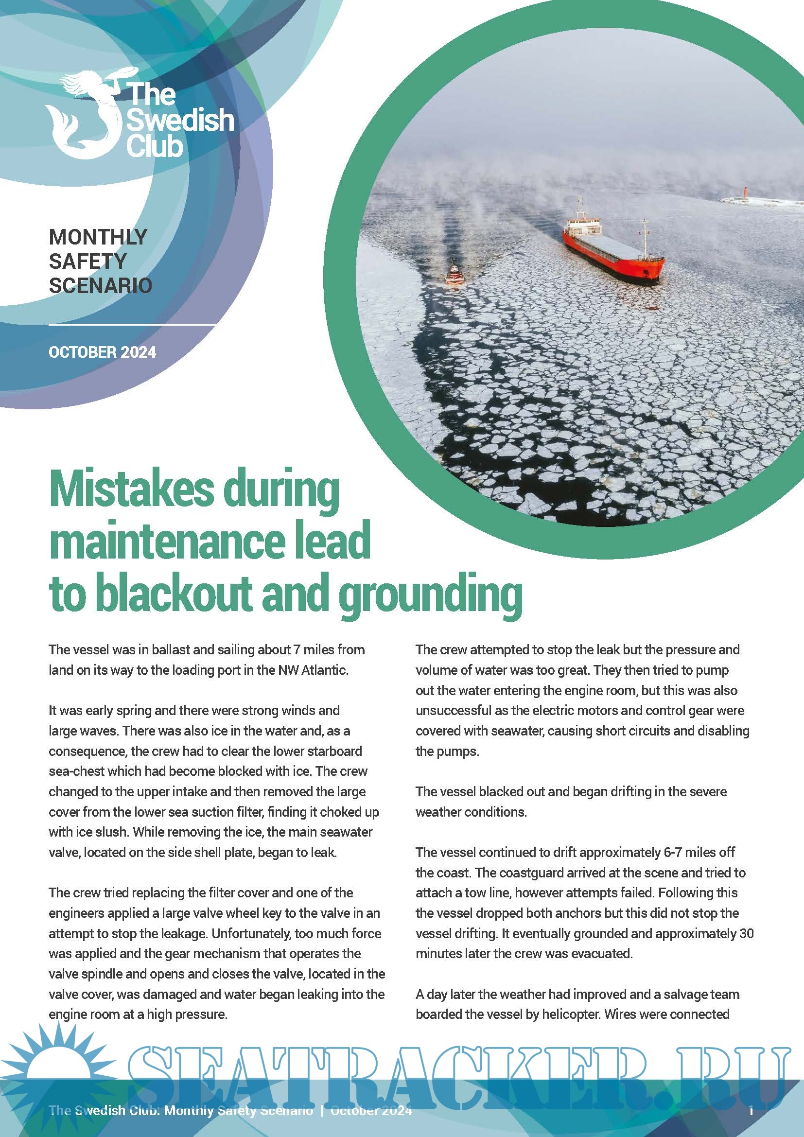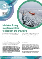 Year: 2024 Language: English Author: the Swedish Club Genre: Other, Periodical publication Edition: October 2024 Format: PDF Quality: eBook Pages count: 3 Description: The Club is publishing, on a monthly basis, a new Monthly Safety Scenario (MSS) to assist owners in their efforts of complying with the above regulations. Alternative scenarios will be uploaded in SCOL. It is easy to download the MSS and enter the written conclusions from the meeting and send feedback to the shore-based organisation. Issue October, 2024 | Mistakes during maintenance lead to blackout and grounding Under the ISM requirement, owners are obliged to carry out monthly safety meetings or safety committee meetings onboard their vessels. This obligation stems from Chapter 5 of the ISM Code: “Master’s responsibility and authority” and furthermore from “5.1.2, motivating the crew in the observation of that policy.