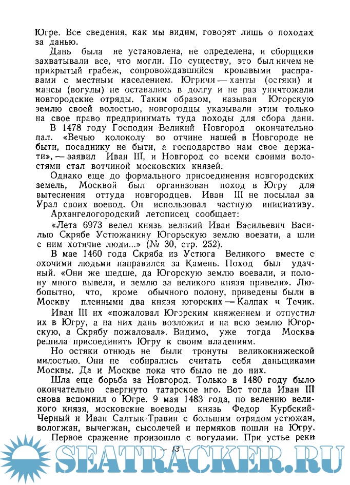 Год выпуска: 1945 Язык: Русский Автор: Самойлов В. А. Жанр: Историческое Издательство: Главсевморпути Формат: PDF Качество: Отсканированные страницы Количество страниц: 190 Описание: В книге уделено много внимания тем людям, которым обязана наша родина приобретением грандиозных по размерам и природным богатствам территорий северной Азии. Со страниц книги встают изумительные образы русских людей XVI–XVII вв., потомков предприимчивых новгородских ушкуйников и поморов, выходцев из древних русских земель — Устюга Великого, Соли Вычегодской. Исключительное мужество, нечеловеческая выносливость и стойкость сочетались у них с горячей любовью к родине и редкой скромностью.