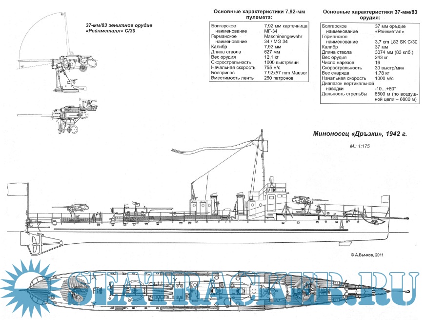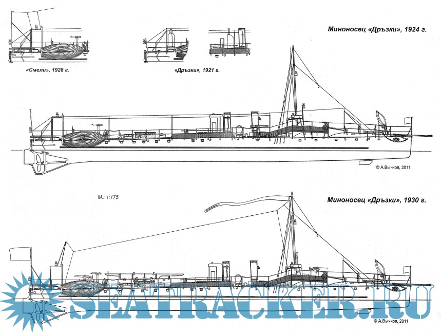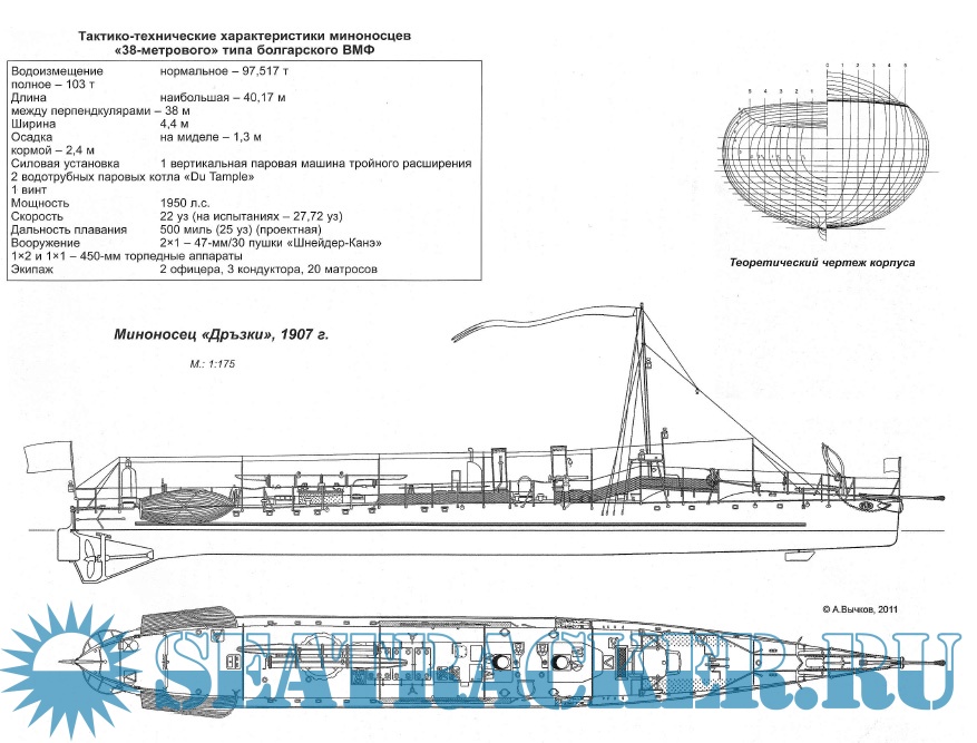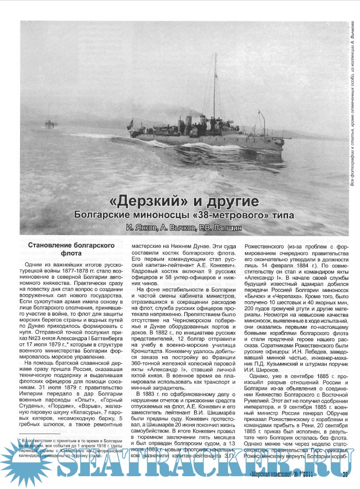 Работу по болгарским миноносцам типа "Дерзкий" специально для нашего журнала на основе архивных материалов подготовили болгарские историки Иван Янков (г. Пловдив) и д-р Александр Вычков (А. Въчков; г. Варна) в соавторстве с Романом Витальевичем Лапшиным (г. Запорожье, Украина).