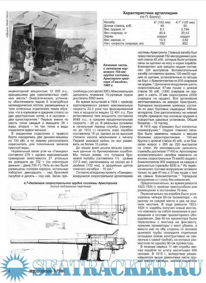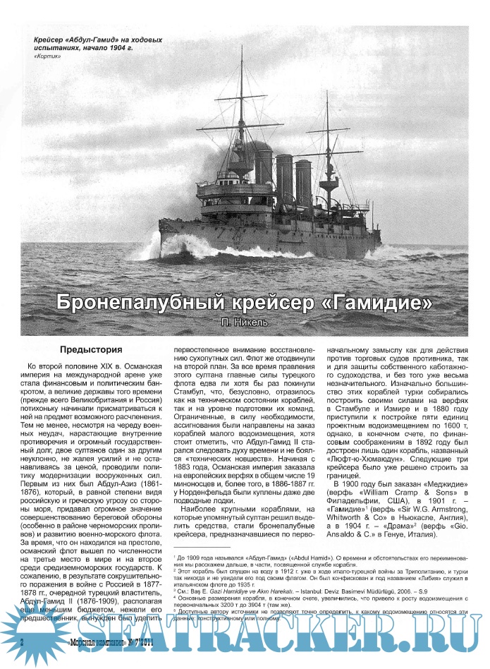Автор работы о турецком крейсере "Гамидие" - польский историк Пётр Никель (Piotr Nykiel). Впервые она была опубликована в журнале "Октету Wojenne" (Nr.100-101). Перевод с польского выполнил Ростислав Федорович Сидоренко (г. Нижневартовск, ХМАО), графику - Ежи Левандовский (Jerzy Lewandowski, Польша). При подготовке к публикации в нашем журнале статья была существенно откорректирована: исправлены сведения по конструкции корабля и информация, касающаяся действий русского флота в Первую мировую войну. Эту работу проделали М.С. Барабанов и В.В. Яровой.