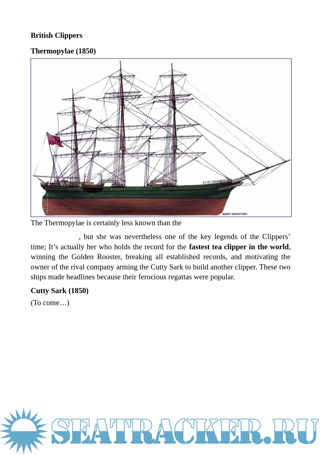 Year: 2020 Language: English Author: - Genre: Encyclopedia Format: PDF, DOCx Quality: eBook Pages count: 27 Description: The term itself was controversial. “Clipper” could either be likened to “to clip”, cut, cross quickly, or get close to an marine slang term for the “pinnacle” of its field, a thoroughbred of the seas as it was also associated with race horses. It was influenced by Dryden, the English poet that first used it to describe the swift flight of a falcon in the 17th century.