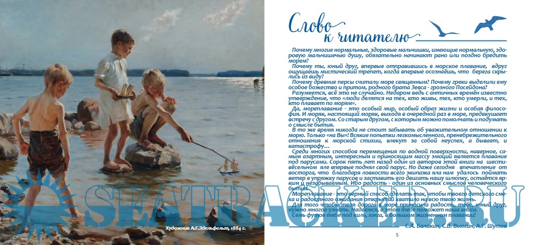 Мореплавание — это верный способ сделать так, чтобы твоего детского смеха и радостного ожидания открытий хватило на всю твою жизнь. Для того чтобы твоя дорога в море приносила радость, тебе, юный друг, нужно многое узнать. Надеемся, в этом тебе поможет наша книга.