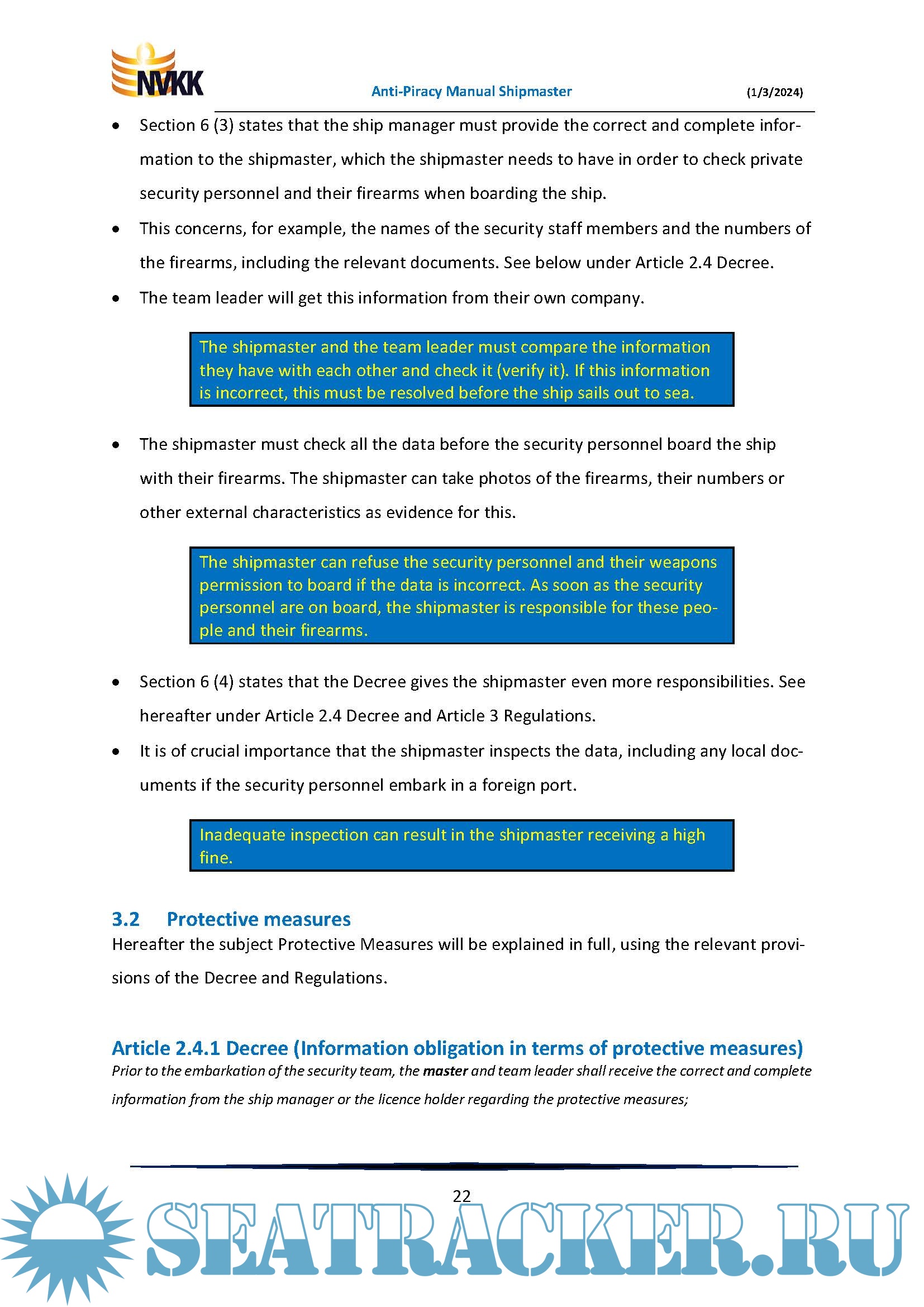 The core of this Manual is formed by a number of uniquely numbered checklists to make sure the shipmaster does not forget anything. Furthermore, a number of important subjects are discussed, such as the use of force, notifications and reports, fines, etc.