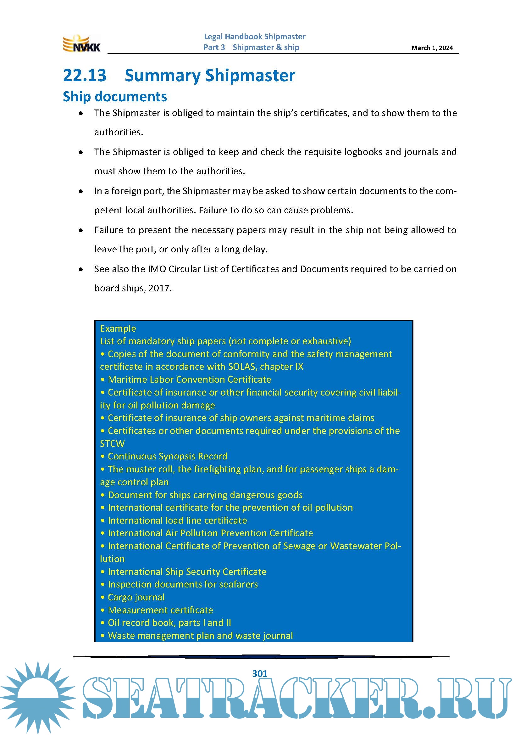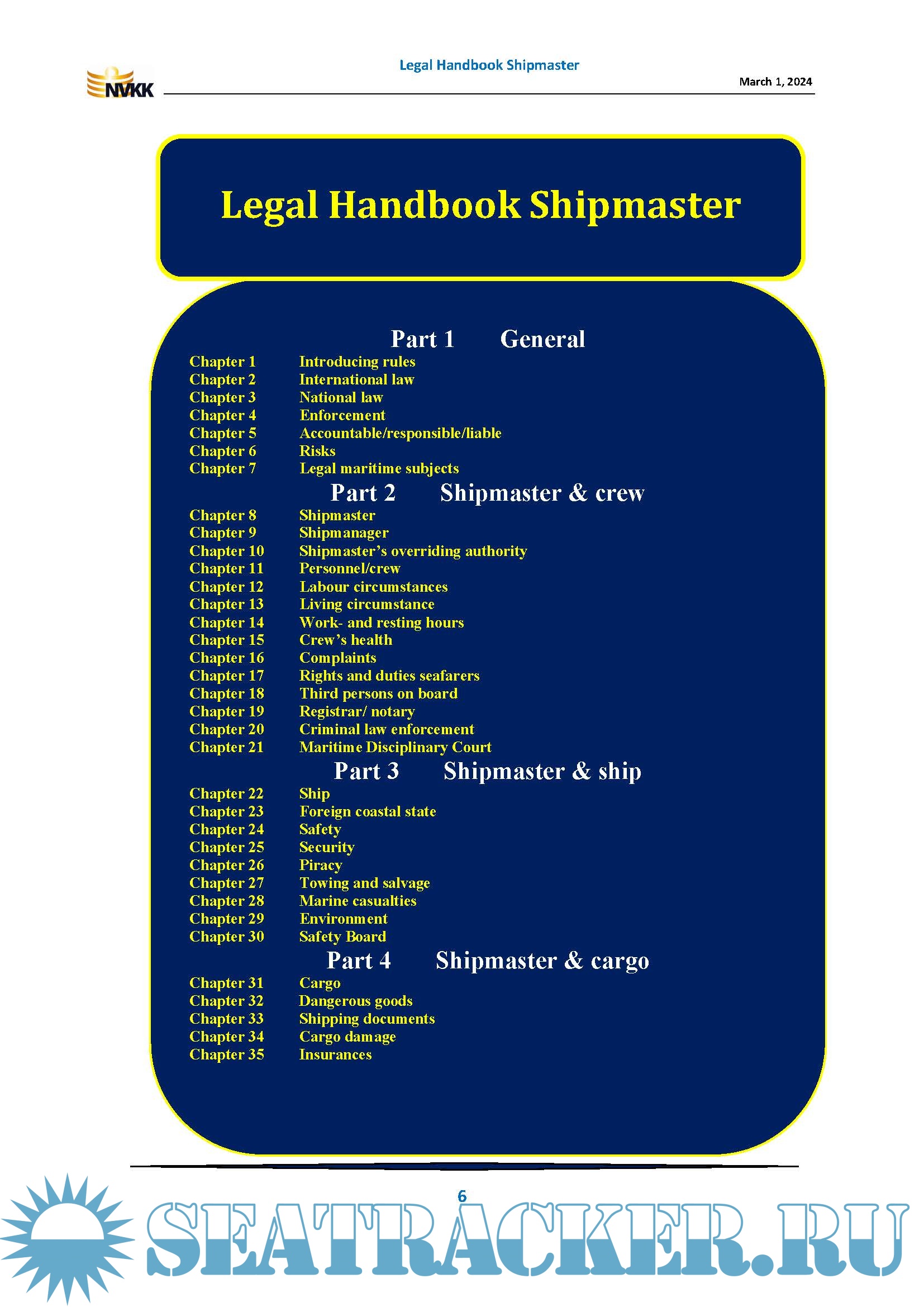 This Handbook has been written for the Shipmaster, but it can be used by all other interested parties, regardless of the ship’s flagstate or nationality, worldwide. The national maritime legislation of all countries is, more or less, similar because these legislations originate from a variety of international maritime agreements.