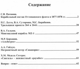 Описание: Представлены справочник по корабельному составу Оттоманского флота период русско-турецкой войны 1877-1878 гг.; статьи по малоизвестной серии советских послевоенных тральщиков, немецким многоцелевым кораблям типа MZ, итальянскому противолодочному кораблю «Альбатрос» и другие материалы.