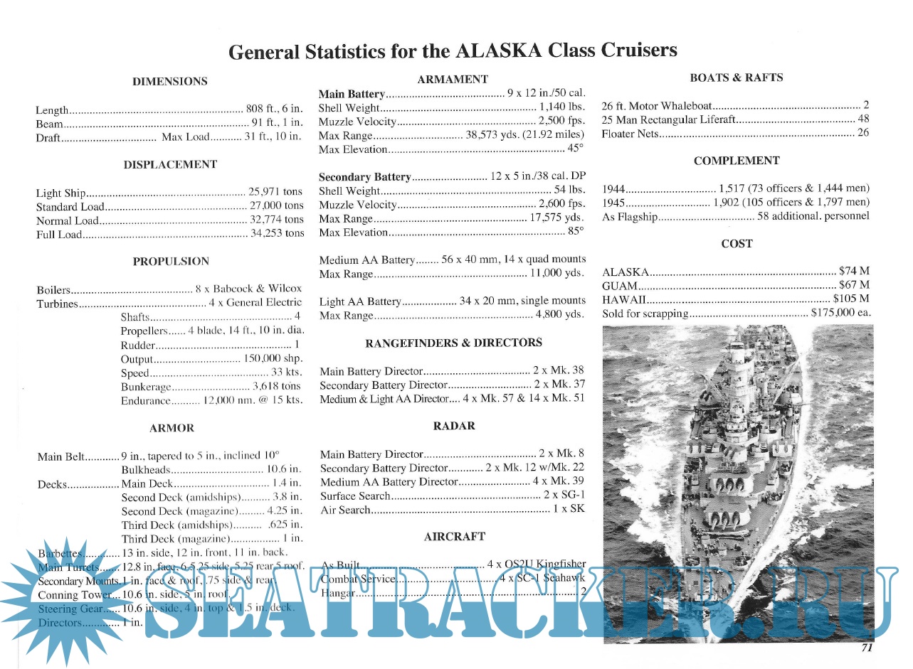 Year: 2015 Language: English Author: Steve Wiper Genre: Historical Publisher: Classic Warships Publishing Edition: Warship Pictorial 43 Format: PDF Quality: Scanned pages Pages count: 76 Description: The Alaska-class were six large cruisers ordered before World War II for the United States Navy (USN), of which only two were completed and saw service late in the war. The USN designation for the ships of this class was 'large cruiser' (CB), a designation unique to the Alaska-class, and the majority of leading reference works consider them as such. However, various other works have alternately described these ships as battlecruisers despite the USN having never classified them as such, and having actively discouraged the use of the term in describing the class. The Alaskas were all named after territories or insular areas of the United States, signifying their intermediate status between larger battleships (which were mostly named after states) and smaller heavy and light cruisers (which were named after cities)
