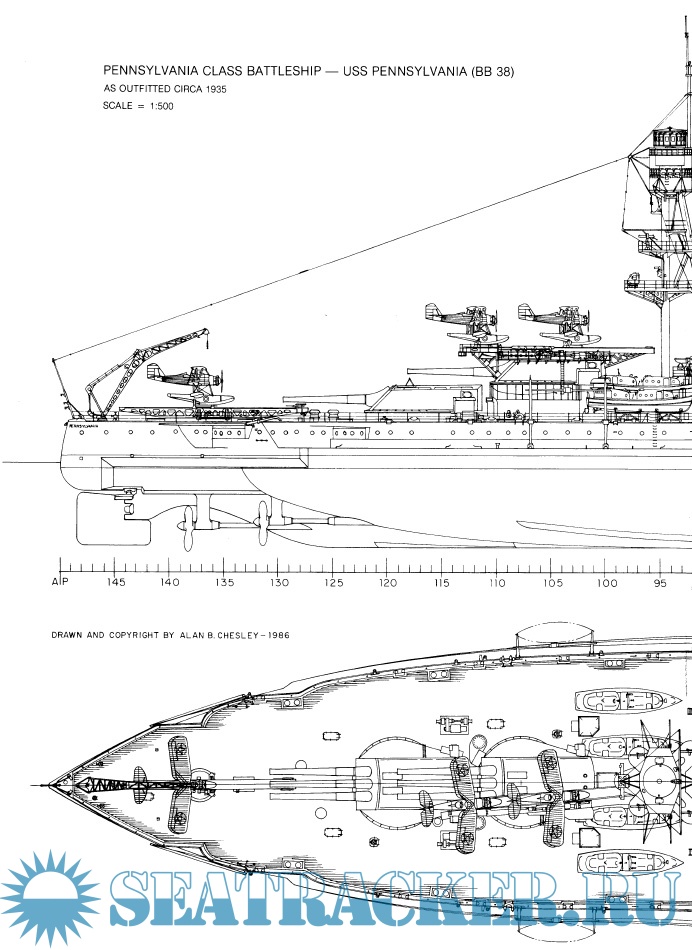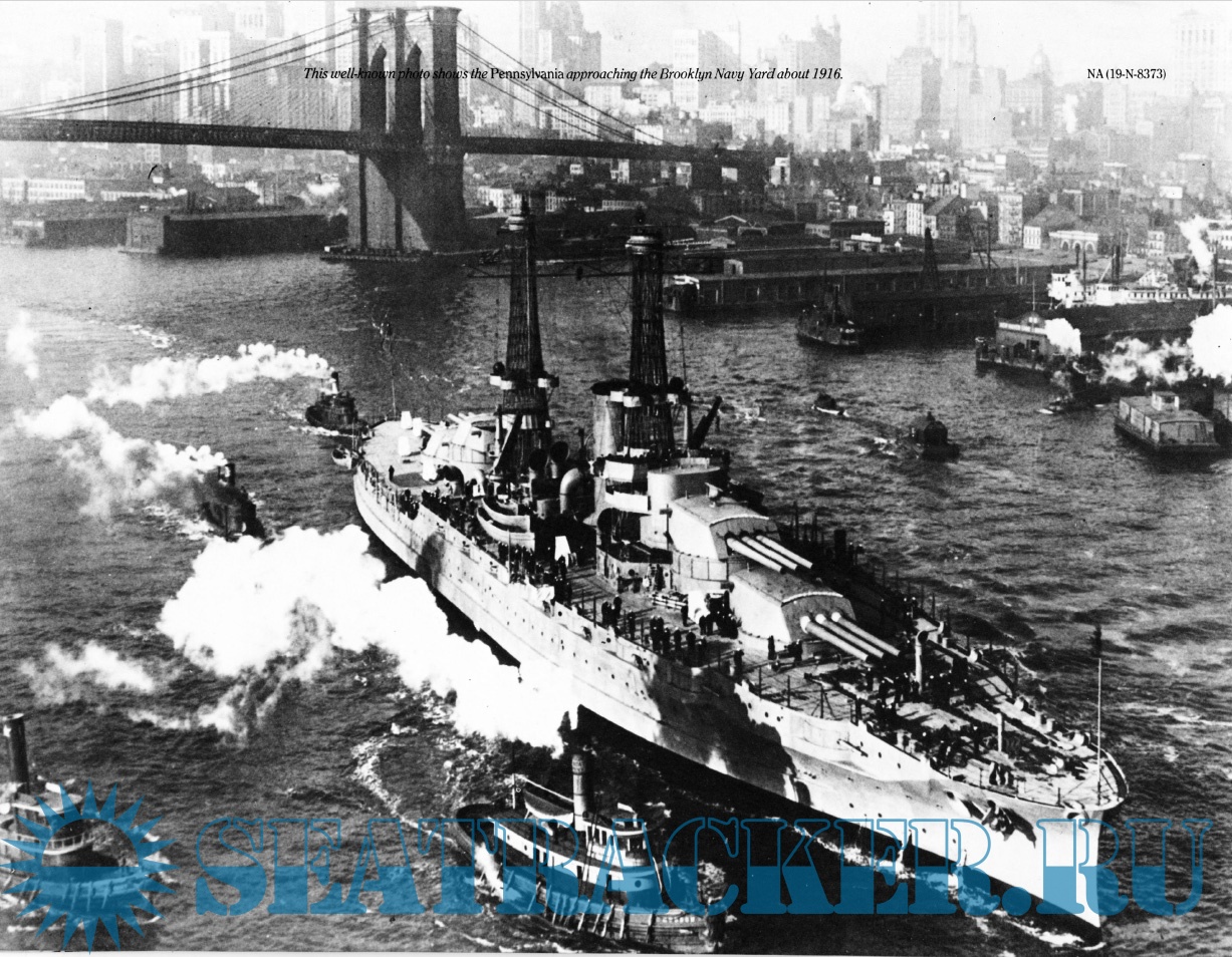 Description: USS Pennsylvania (BB-38) was the lead ship of the Pennsylvania class of super-dreadnought battleships built for the United States Navy in the 1910s. The Pennsylvanias were part of the standard-type battleship series, and marked an incremental improvement over the preceding Nevada class, carrying an extra pair of 14-inch (356 mm) guns for a total of twelve guns. Named for the Commonwealth of Pennsylvania, she was laid down at the Newport News Shipbuilding and Drydock Company in October 1913, was launched in March 1915, and was commissioned in June 1916. Equipped with an oil-burning propulsion system, Pennsylvania was not sent to European waters during World War I, since the necessary fuel oil was not as readily available as coal. Instead, she remained in American waters and took part in training exercises; in 1918, she escorted President Woodrow Wilson to France to take part in peace negotiations.
