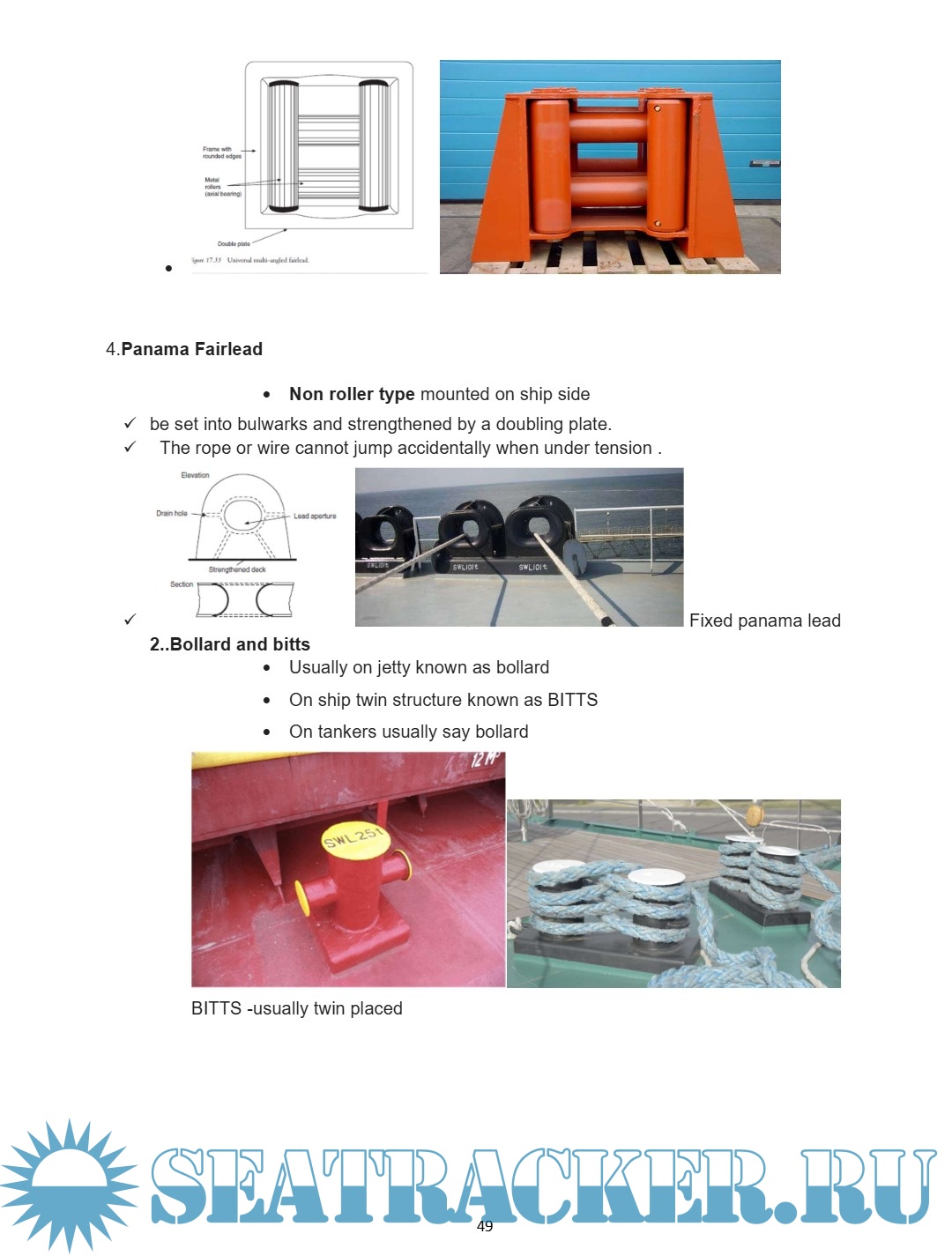 Description of rollers, fair lead types, mooring bits, and cable stopper deck attachment.