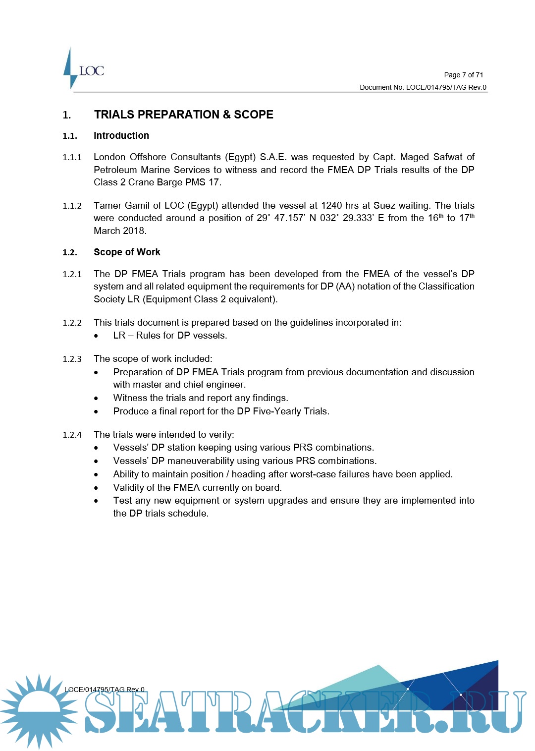 Description: London Offshore Consultants (Egypt) S.A.E. was requested by Capt. Maged Safwat of Petroleum Marine Services to witness and record the FMEA DP Trials results of the DP Class 2 Crane barge PMS 17.