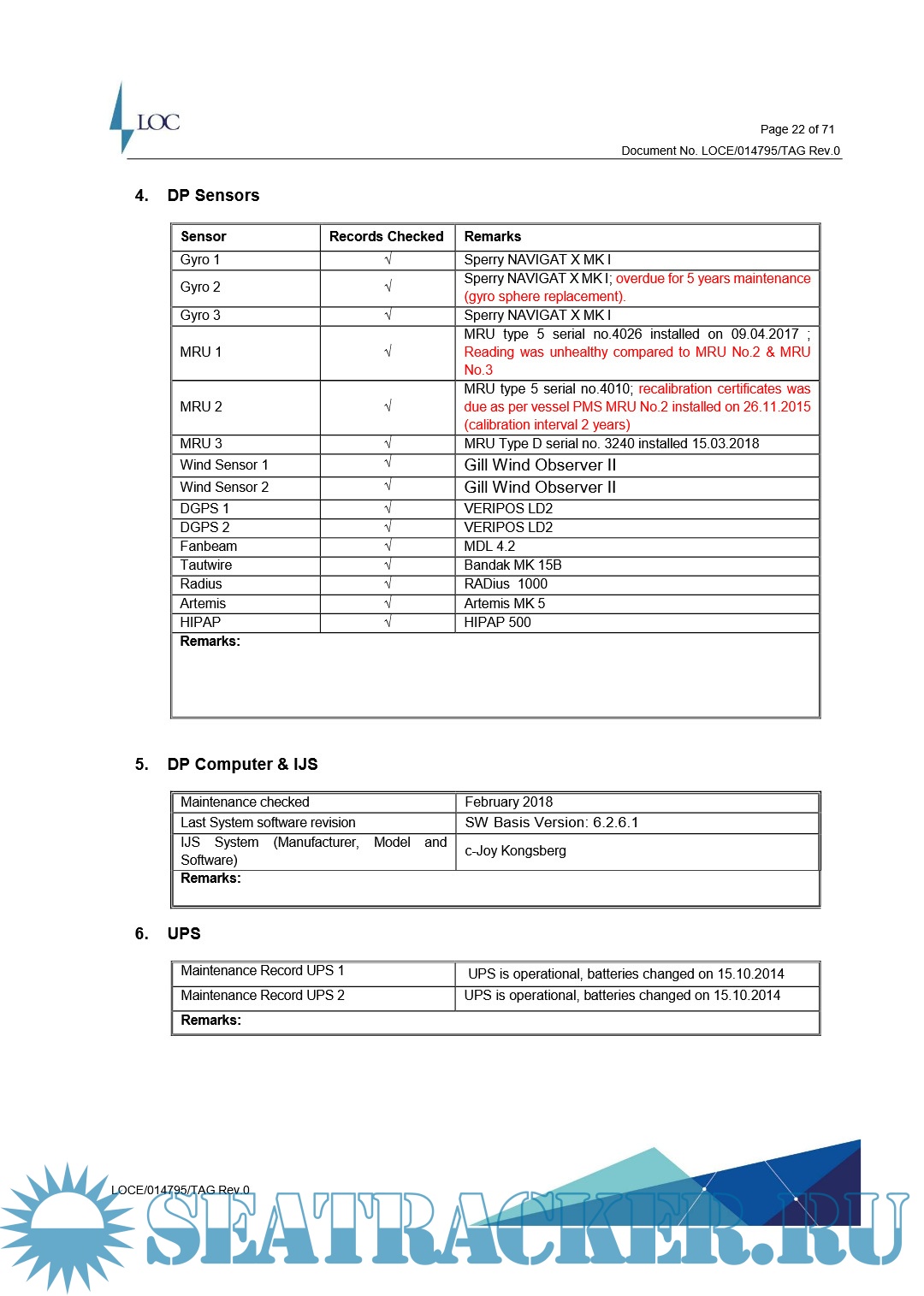 Summary .............................................................. 3 1. Trials preparation & scope ........................................ 7 1.1. Introduction .................................................... 7 1.2. Scope of work ................................................... 7 1.3. Conduct of work ................................................. 8 1.4. Purpose of fmea DP proving trials ............................... 9 1.5. Purpose of the DP annual trials ................................. 9 1.6. Scope of DP assessment .......................................... 9 1.7. Rules of testing ................................................ 9 2. Vessel particulars ................................................ 11 2.1. General ......................................................... 11 2.2. Power generation ................................................ 12 2.3. Thrusters ....................................................... 12 2.4. Vessel management system ........................................ 12 2.5. Vessel monitoring system ........................................ 12 2.6. DP equipment .................................................... 12 2.7. FMEA ............................................................ 13 2.8. System upgrades & modifications ................................. 13 2.9. Machinery configuration during trials ........................... 13 2.10. Worst case failure design intent ............................... 14 2.11. Critical activity mode configuration ........................... 14 2.12. Task appropriate mode .......................................... 14 2.13. Vessel DP capability ........................................... 14 3. Conclusion & comments from trials ................................. 15 3.1. Conclusions ..................................................... 15 3.2. Power generation ................................................ 15 3.3. Power distribution .............................................. 15 3.4. Power management system ......................................... 15 3.5. Control systems ................................................. 15 3.6. Environmental & heading sensors ................................. 15 3.7. Position references ............................................. 15 3.8. DP control ...................................................... 16 3.9. Personnel ....................................................... 16 4. Findings .......................................................... 17 4.1. Explanation ..................................................... 17 4.2. Outstanding concerns from the previous proving trials report .... 17 4.3. Findings – Category A ........................................... 18 4.4. Findings – Category B ........................................... 18 4.5. Findings – Category C ........................................... 19 Appendix A maintenance status report ................................. 20 1. Propulsion & thrusters ............................................ 21 2. Diesel generators ................................................. 21 3. Switchboard maintenance ........................................... 21 4. DP sensors ........................................................ 22 5. DP computer & IJS ................................................. 22 6. UPS ............................................................... 22 7. DP documentation .................................................. 23 8. Hardware modifications ............................................ 23 9. Capability plots .................................................. 24 10. DP incidents ..................................................... 24 11. Pre-trial check .................................................. 24 Appendix B five-yearly DP trials test reports ........................ 25 Test no.1 Software status ............................................ 26 Test no.2 Communications ............................................. 27 Test no.3 DP mode system ............................................. 28 Test no.4 DP PRS offsets & position control .......................... 29 Test no.5 DGPS1 failures ............................................. 34 Test no.6 DGPS2 failures ............................................. 35 Test no.7 Fanbeam failures ........................................... 36 Test no.8 Taut wire failures ......................................... 37 Test no.9 Hydro-acoustic HIPAP failures .............................. 38 Test no.10 Radius 1000 failures ...................................... 39 Test no.11 Artemis MK 5 failures ..................................... 40 Test no.12 Heading control and heading out of limit alarms ........... 41 Test no.13 Gyro sensor failures ...................................... 42 Test no.14 MRU's signal failure tests ................................ 43 Test no.15 Wind sensor failures ...................................... 44 Test no.16 DP network tests .......................................... 45 Test no.17 DP controller and os’s failures ........................... 46 Test no.18 Independent joystick system ............................... 47 Test no.19 DP consequence analysis ................................... 48 Test no.20 Mathematical model test.................................... 49 Test no.21 Thruster emergency stop ................................... 50 Test no.22 DP UPS 1 .................................................. 51 Test no.23 DP UPS 2 .................................................. 52 Test no.24 Bow thruster T1 (PS) signal failure ....................... 53 Test no.25 Bow thruster T2 (STBD) signal failure ..................... 55 Test no.26 Stern thruster T3 (PS) signal failure ..................... 57 Test no.27 Stern thruster T4 (STBD) signal failure ................... 59 Test no.28 DP cards signal failure ................................... 61 Test no.29 Main 380/220v/110v distributions failure .................. 63 Test no