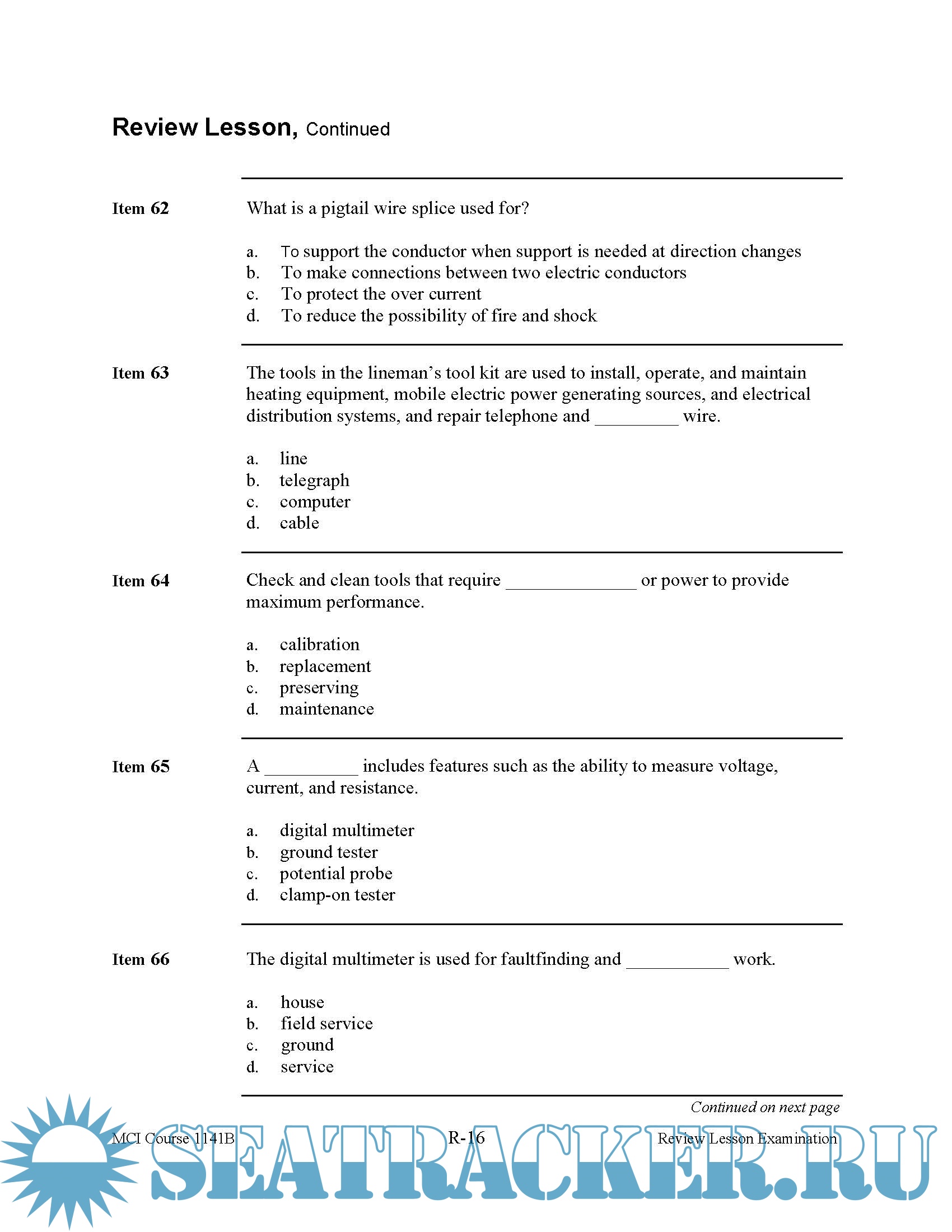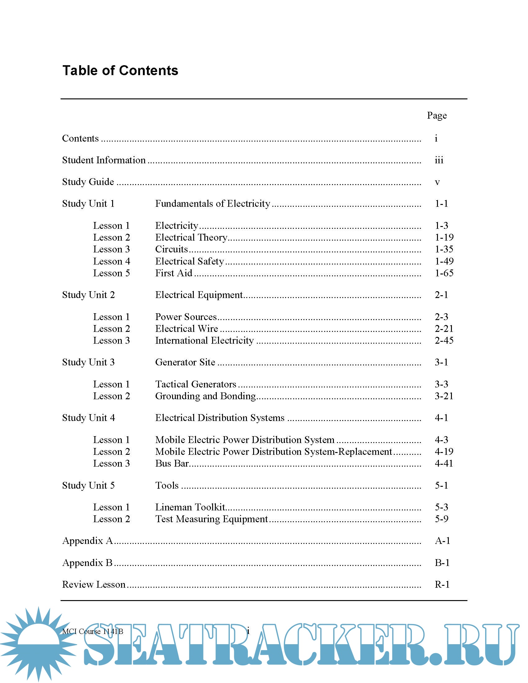 Year: 2012 Language: English Author: Marine Corps Institute Genre: Training courses Publisher: Marine Corps Institute Edition: 2012 Reprint Format: PDF Quality: eBook Pages count: 316 Description: The subject course provides instruction on the basic fundamentals of electricity, safety, power generation and distribution of electricity. The subject course provides instruction on the deployment, installation, and safety of all forms of electrical power and distribution equipment, and those functions that are essential to all units that are establishing an operational base within a field environment. This course is intended for instructional purposes only. This course is designed for the Marine, private through staff sergeant, MOS 1141, Marine Electrician. This course can also be useful to units/commands that desire to enhance their understanding of electrical distribution equipment of their non-utilities MOS personnel.