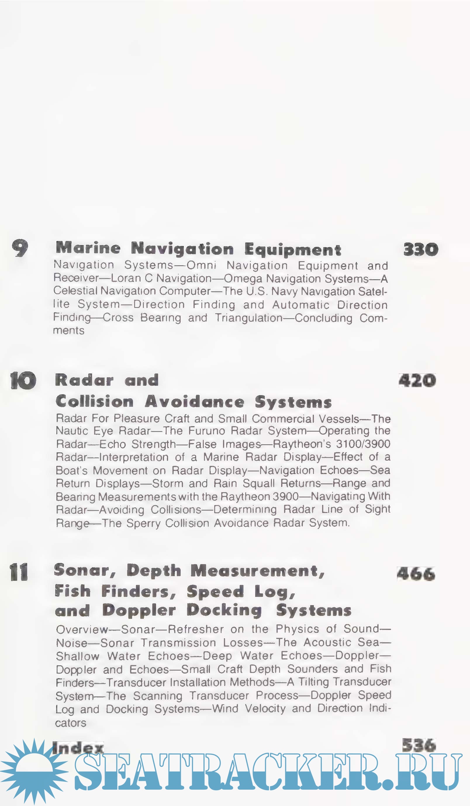 The book then progresses and considers electrical devices for safety, pleasure, and comfort; then, into the various electronic devices which provide navigation, communications, soundings. and movement of and for the boats in a marina. in the harbor, or at sea.