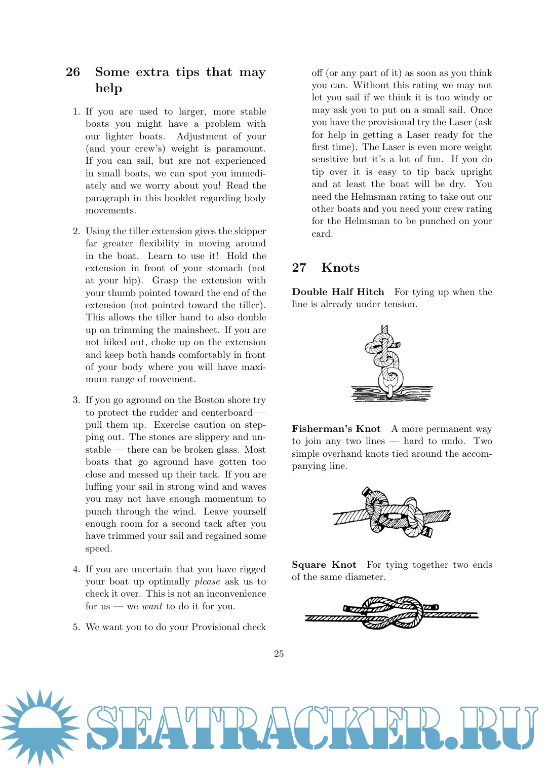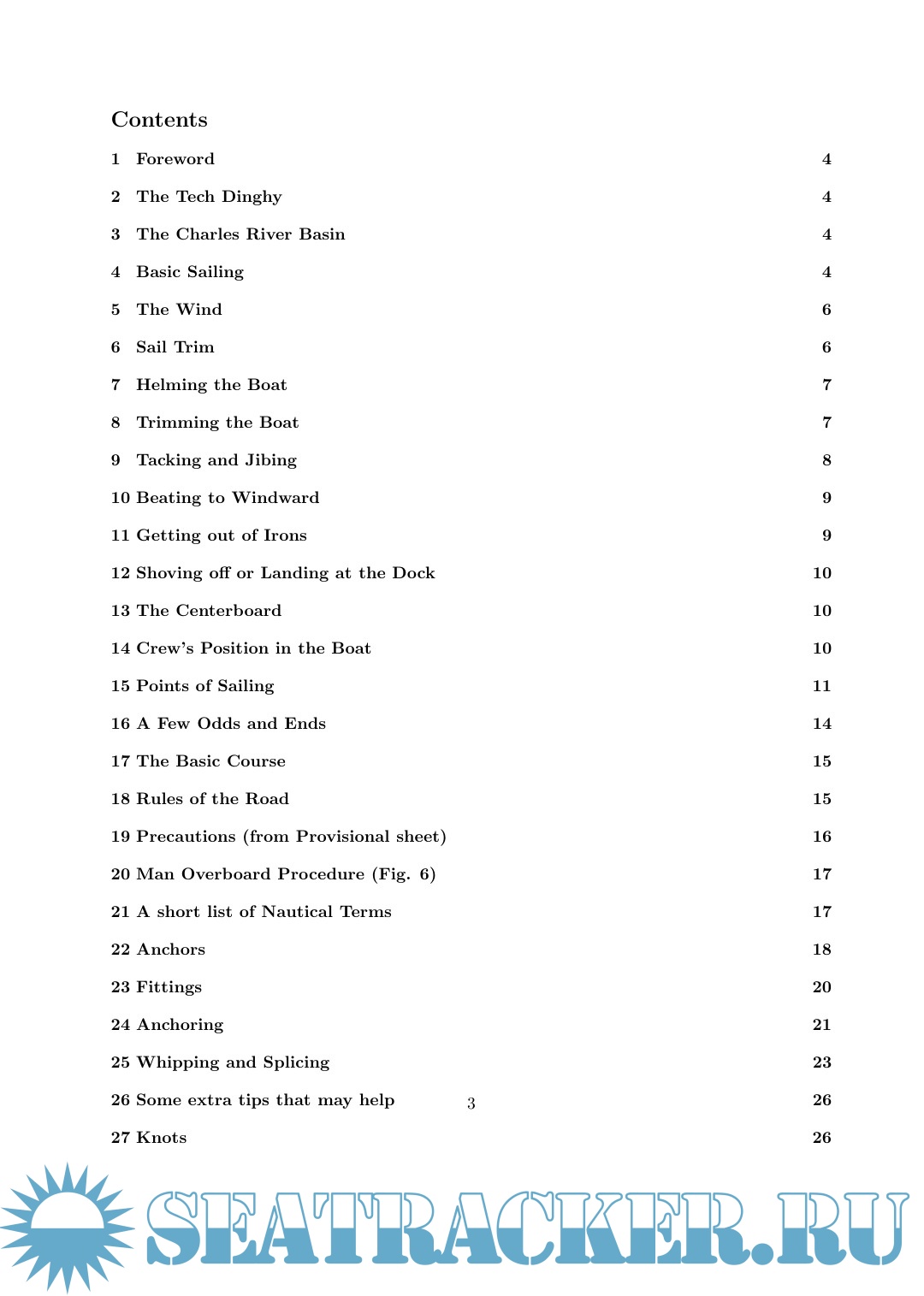 Year: 1995 Language: English Author: Brown H. Genre: Manual Publisher: Massachusetts Institute of Technology Format: PDF, DOCx Quality: eBook Pages count: 27 Description: The purpose of this booklet is to tell you something about our Tech Dinghy and how to sail it, and specifically to provide you with the information necessary to pass the Nautical Association's Provisional, Crew and Helmsman checkoffs. Please do not think of these skill checks as tests, but instead, as measures of your understanding of our sport. We don't expect perfection from our beginners, but only that our members be able to safely handle the boats and themselves on the river. For those who wish it, there will be much more that can be learned about other boats and other waters, but what can be learned here will provide the basis to build on.