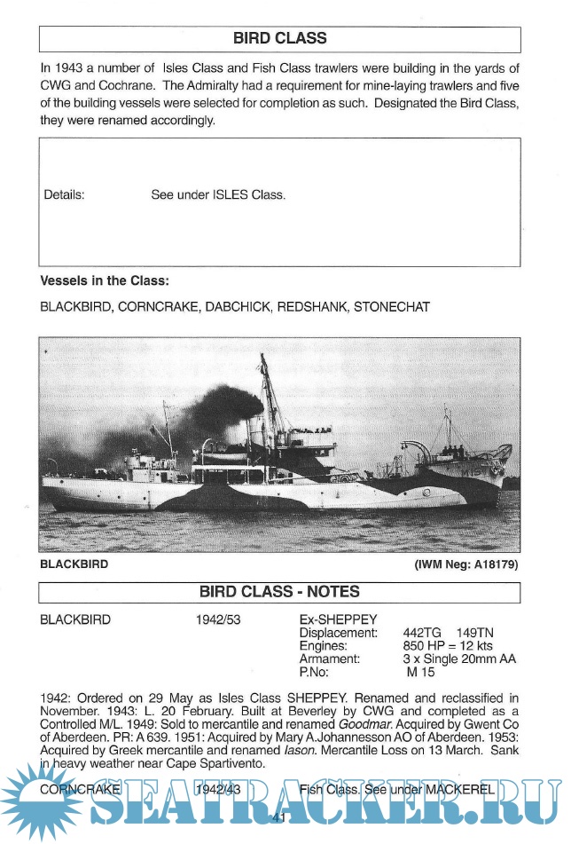 Description: Naval trawlers were purpose-built or requisitioned and operated by the Royal Navy (RN), mainly during World Wars I and II. Vessels built to Admiralty specifications for RN use were known as Admiralty trawlers. All trawlers operated by the RN, regardless of origin, were typically given the prefix HMT, for "His Majesty's Trawler".