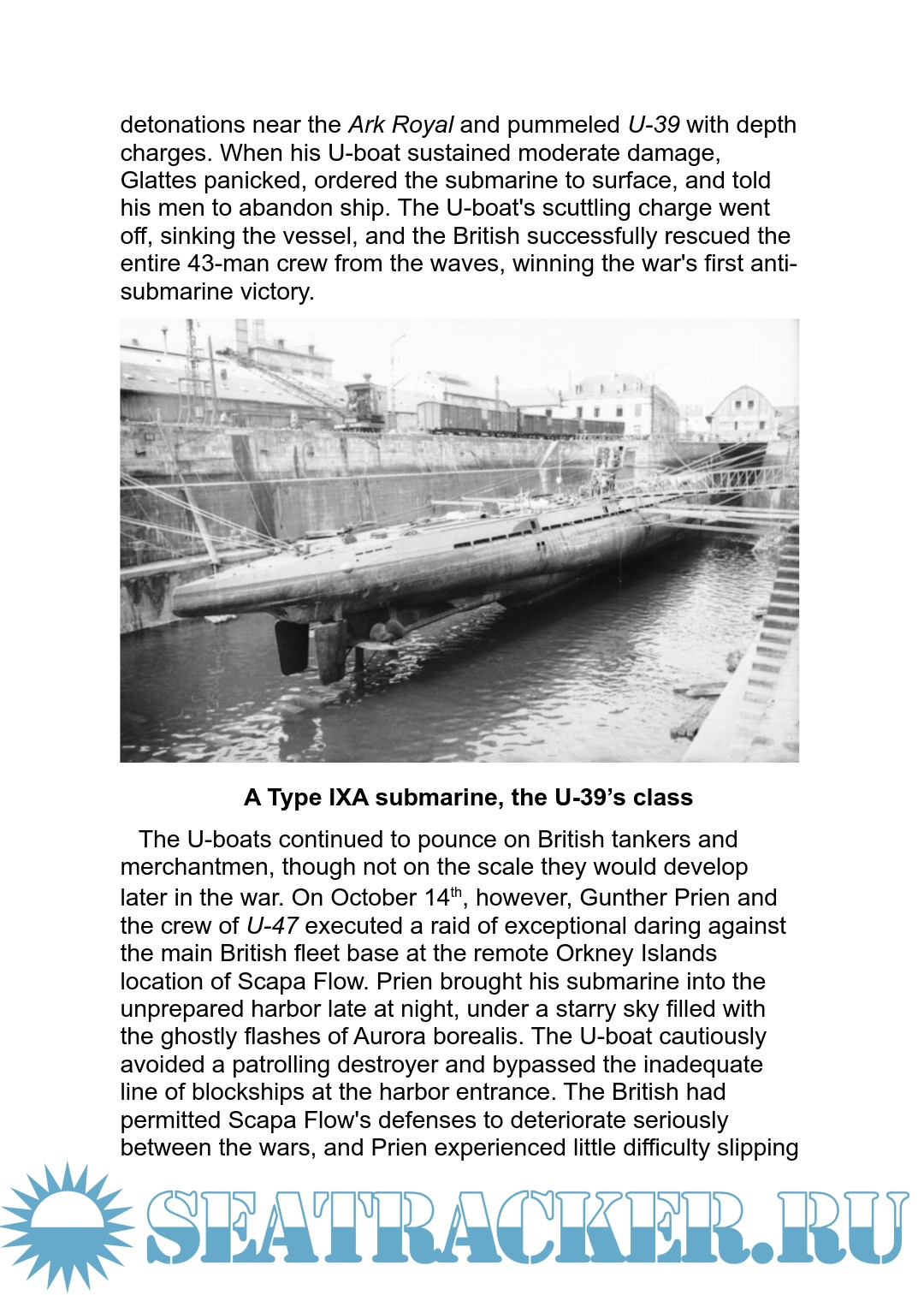 World War I witnessed the First Battle of the Atlantic, when the Kaiserreich unleashed its U-boats against England. During the war, the German submarines sent much of the British merchant marine to the bottom. Indeed, German reliance on U-boats in both World War I and World War II stemmed largely from their nation's geography. The Germans eventually recognized the superiority of the Royal Navy and its capacity to blockade Germany's short coastline in the event of war. While the British could easily interdict surface ships, submarines slipped from their Kiel or Hamburg anchorages unseen, able to prey upon England's merchant shipping.