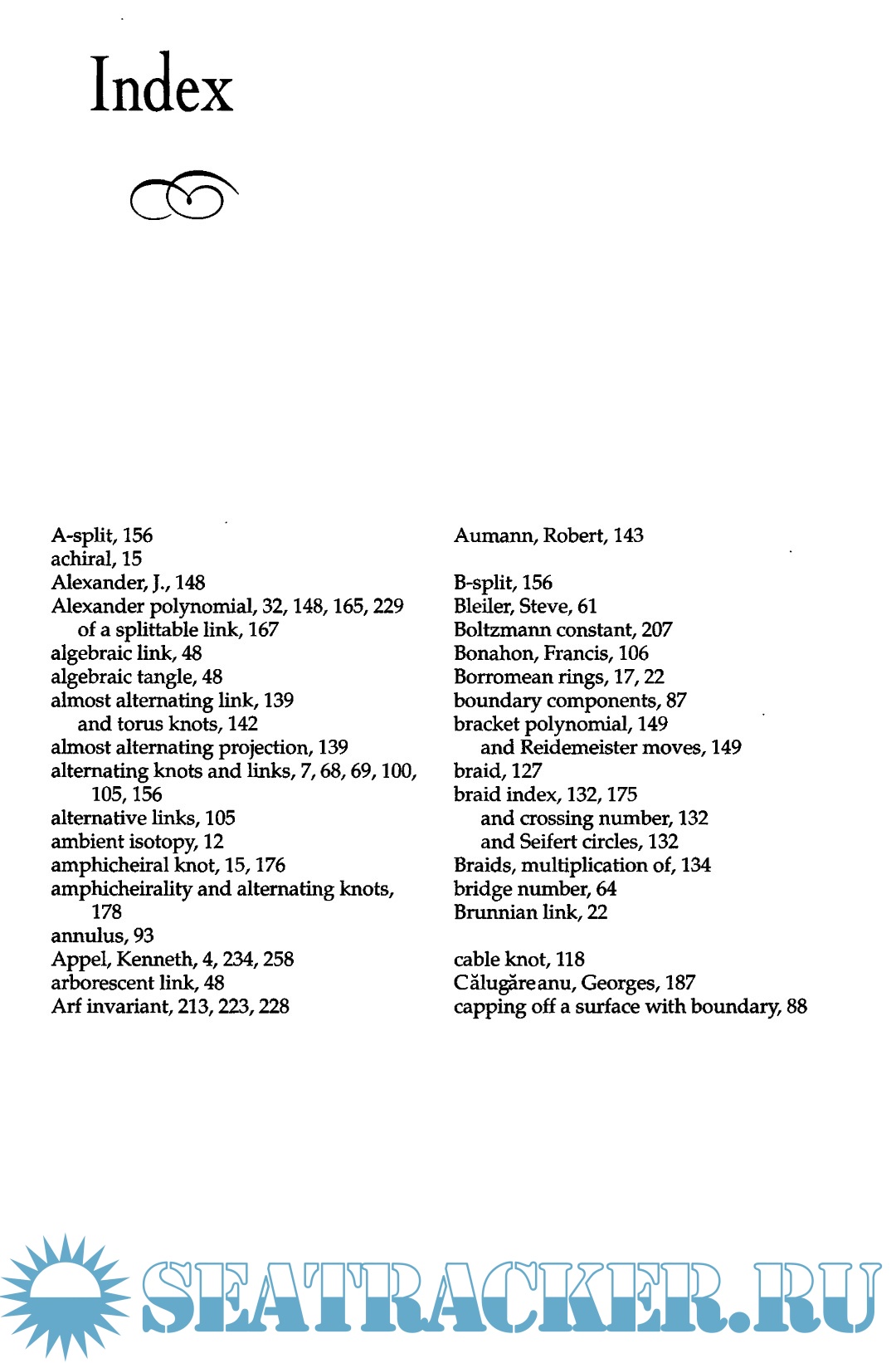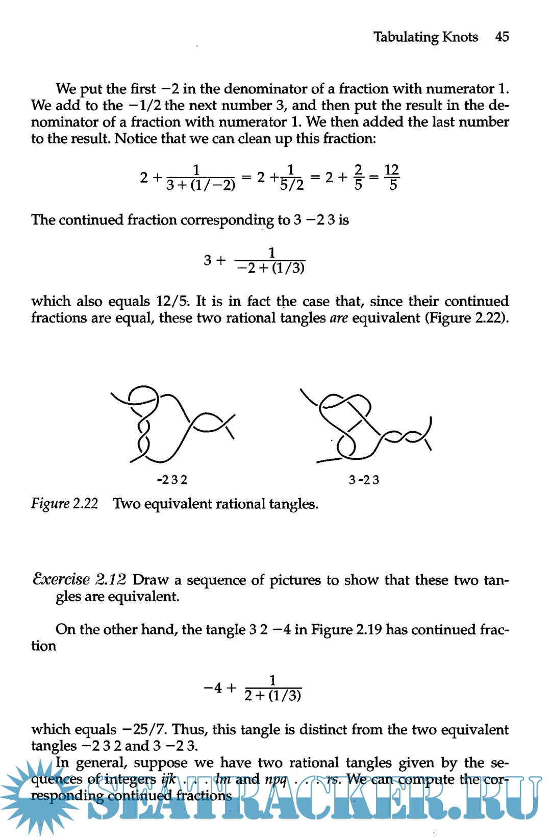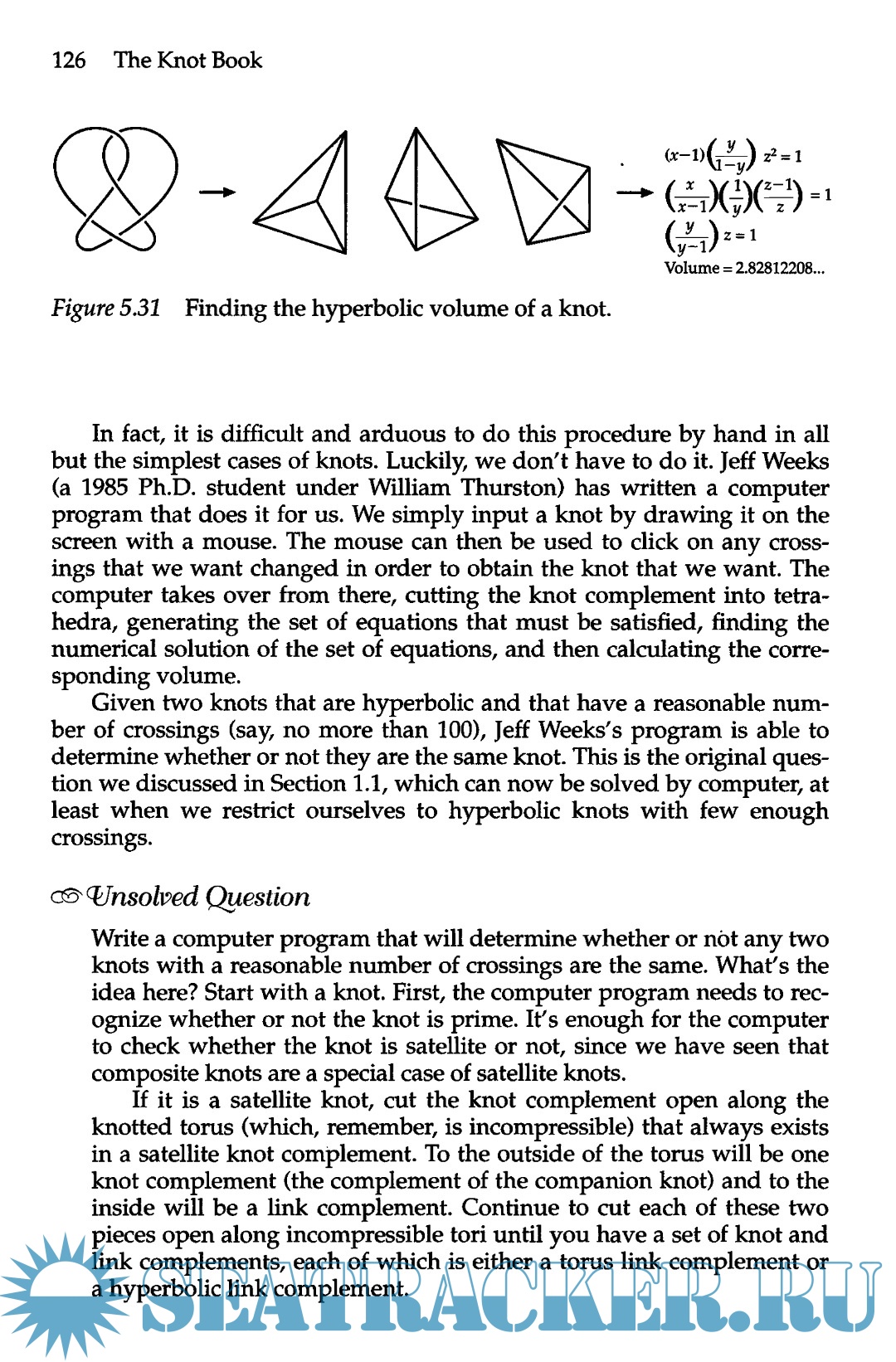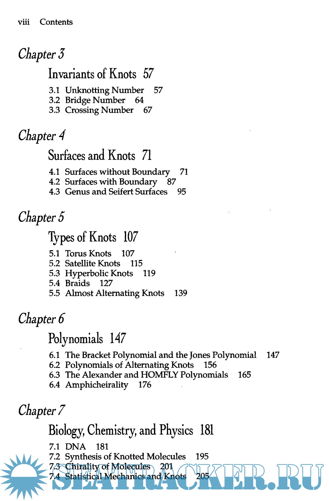 Year: 2004 Language: English Author: Adams C. Genre: Knots Publisher: W.H. Freeman and Company ISBN: 978-0-8218-3678-1 Format: PDF Quality: Scanned pages Pages count: 308 Description: Mathematics is an incredibly exciting and creative field of endeavor. Yet most people never see it that way. Nonmathematicians too often assume that we mathematicians sit around talking about what Newton did three hundred years ago or calculating a couple of extra million digits of tt. They do not realize that more new mathematics is being created now than at any other time in the history of humankind. Explaining the field of knot theory is a particularly effective way to dispel this misconception. Here is a field that is over one hundred years old, and yet some of the most exciting results have occurred in the last fifteen years. Easily stated open questions still abound, and one can get a taste for what it is like to do research very quickly. The other tremendous advantage that knot theory has over many other fields of mathematics is that much of the theory can be explained at an elementary level. One does not need to understand the complicated machinery of advanced areas of mathematics to prove interesting results. My hope is that this book will excite people about mathematics that it will motivate them to continue to explore other related areas of mathematics and to proceed to such topics as topology, algebra, differential geometry, and algebraic topology. Unfortunately, mathematics is often taught as if the only goal were to pass a body of information from one person to the next. Although this is certainly an important goal, it is essential to teach an appreciation for the beauty of mathematics and a sense of the excitement of doing mathematics. Once readers are hooked, they will fill in the details themselves, arid they will go a lot farther and learn a lot more. Who, then, is this book for? It is aimed at anyone with a curiosity about mathematics. I hope people will pick up this book and start reading it on their own. I also hope that they will do the exercises: the only way to learn mathematics is to do it. Some of the exercises are straightforward; others take some thought. The very hardest are starred and can be a bit more challenging. Scientists with primary interests in physics or biochemistry should find the applications of knot theory to these fields particularly fascinating. Although these applications have only been discovered recently, already they have had a huge impact. This book can be and has been used effectively as a textbook in classes. With the exception of a few spots, the book assumes only a familiarity with high school algebra. I have also given talks on selected topics from this book to high school students and teachers, college students, and students as young as seventh graders. The first six chapters of the book are designed to be read sequentially. With the exception that Section 8.3 depends on Section 7.4, the remaining four chapters are independent and can be read in any order. The topics chosen for this book are not the standard topics that one would see in a more advanced treatise on knot theory. Certainly the most glaring omission is any discussion of the fundamental group. My desire to make this book more interesting and accessible to an audience without advanced background has precluded such topics. The choice of topics has been made by looking for areas that are easy to understand without much background, are exciting, and provide opportunities for new research. Some of the topics such as almost alternating knots are so new that little research has yet been done on them, leaving numerous open questions.