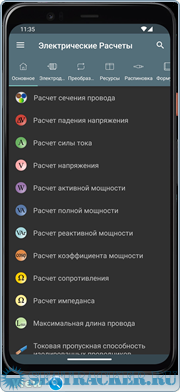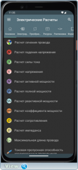 Основные расчеты: Расчет сечения провода, падения напряжения, силы тока, напряжения, активной / полной / реактивной мощности, коэффициента мощности, сопротивления, Максимальная длина провода, Токовая пропускная способность изолированных проводников / неизолированных проводников, Пропускная способность шины, Заполнение кабельных каналов, Подбор автоматического выключателя, Допустимая пропускаемая энергия кабеля (K²S²), Рабочий ток, Реактивное сопротивление, Импеданс, Компенсация реактивной мощности, Реактивная мощность конденсаторов при различных напряжениях, Система заземления, Ток короткого замыкания, Сопротивление проводника, Расчет температуры кабеля, Потери мощности в кабелях, Температурные сенсоры (PT/NI/CU, NTC, термопары…), Значения аналогового сигнала, Эффект Джоуля, Ток повреждения цепей, Оценка риска перенапряжений атмосферного происхождения. Электронные расчеты: Цветовой код резистора / индуктивности, Цветовое значение резисторов, Коды SMD резисторов, Кодировка конденсаторов, Коды индуктивности, Предохранители, Соединение резисторов, Соединение конденсаторов, Резонансная частота, Делитель напряжения, Разветвление тока, Стабилитрон (диод Зенера) как стабилизатор напряжения, Гасящий резистор, Резистор для светодиода, Время работы аккумулятора, Первичная/Вторичная обмотка трансформатора, Длина антенны, Калькулятор дискового пространства и полосы пропускания для систем CCTV. Расчеты двигателя: КПД, Двигатель из трехфазного в однофазный, Конденсаторный запуск однофазного двигателя, Частота вращения электродвигателя, Скольжение электродвигателя, Максимальный крутящий момент, Ток полной нагрузки электродвигателя, Схема трехфазного электродвигателя (6/9/12 отведений от обмотки), Класс изоляции двигателя, Подключение двигателя, Маркировка клемм двигателя. Преобразователи: Преобразование Δ-Y, мощности, Таблица преобразования AWG/мм²/SWG, Сравнение сечений британских и метрических проводов, сечения, длины, напряжения (Амплитуда), sin/cos/tan/φ, энергии, температуры, давления, А•ч/кВт•ч, вар/мкФ, Гаусс/Тесла, RPM (об/мин) - рад/с - м/с, частоты / угловой скорости, крутящего момента, битов и байтов, угловых мер. Ресурсы: Категории применения предохранителей, UL/CSA класс предохранителей, Стандартные значения резисторов, Токо-временные характеристики, Таблица реактивного сопротивления кабелей, Таблица удельного сопротивления и проводимости, Таблица стандартных падений напряжения, Размеры и вес кабелей, Классы защиты IP, Маркировка Atex, Классы приборов, Разрешение систем видеонаблюдения (CCTV), Цветовые коды и данные термопар, Коды стандарта ANSI, Электрические символы, Электричество во всем мире, Типы вилок и розеток, IEC 60320 разъемы, Гнезда C-формы (IEC 60309), Разъемы Nema, Разъемы EV для зарядки электромобилей, Цветовая кодировка проводов, Приставки СИ, Единицы измерения, Размеры трубы. Распиновка: Кабели Ethernet (RJ-45), Ethernet с поддержкой PoE, RJ-9,11,14,25,48, Распиновка, Цветовая кодировка волоконно-оптического кабеля, Scart, USB, HDMI, VGA, DVI, RS-232, FireWire (IEEE1394), Molex, Sata, Apple Lightning, Apple Dock, DisplayPort, PS/2, Raspberry PI, ISO 10487 (Som auto), OBD II, XLR (Audio/DMX), MIDI, Jack, Цветовая маркировка разъемов RCA, Thunderbolt, SD карты, СИМ карты, дисплея LCD 16x2, IO-Link. Приложение также содержит очень полезную форму.