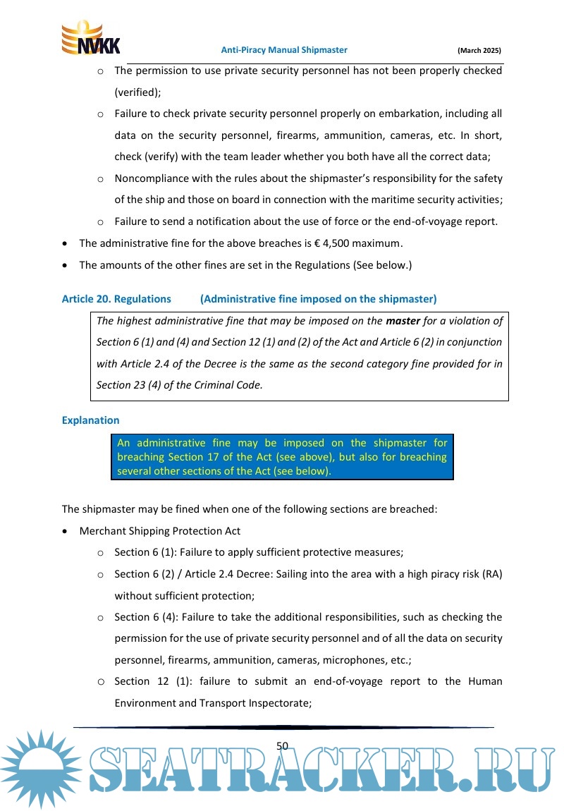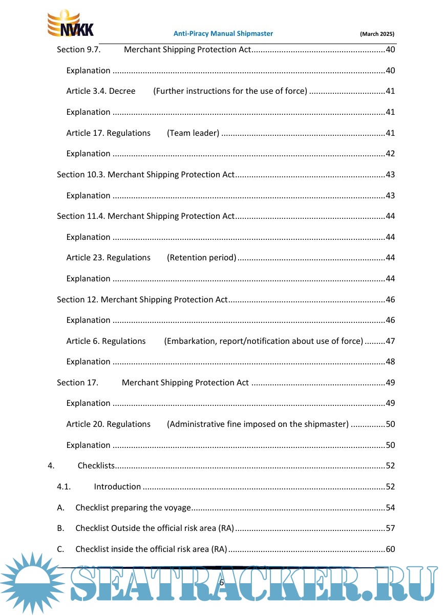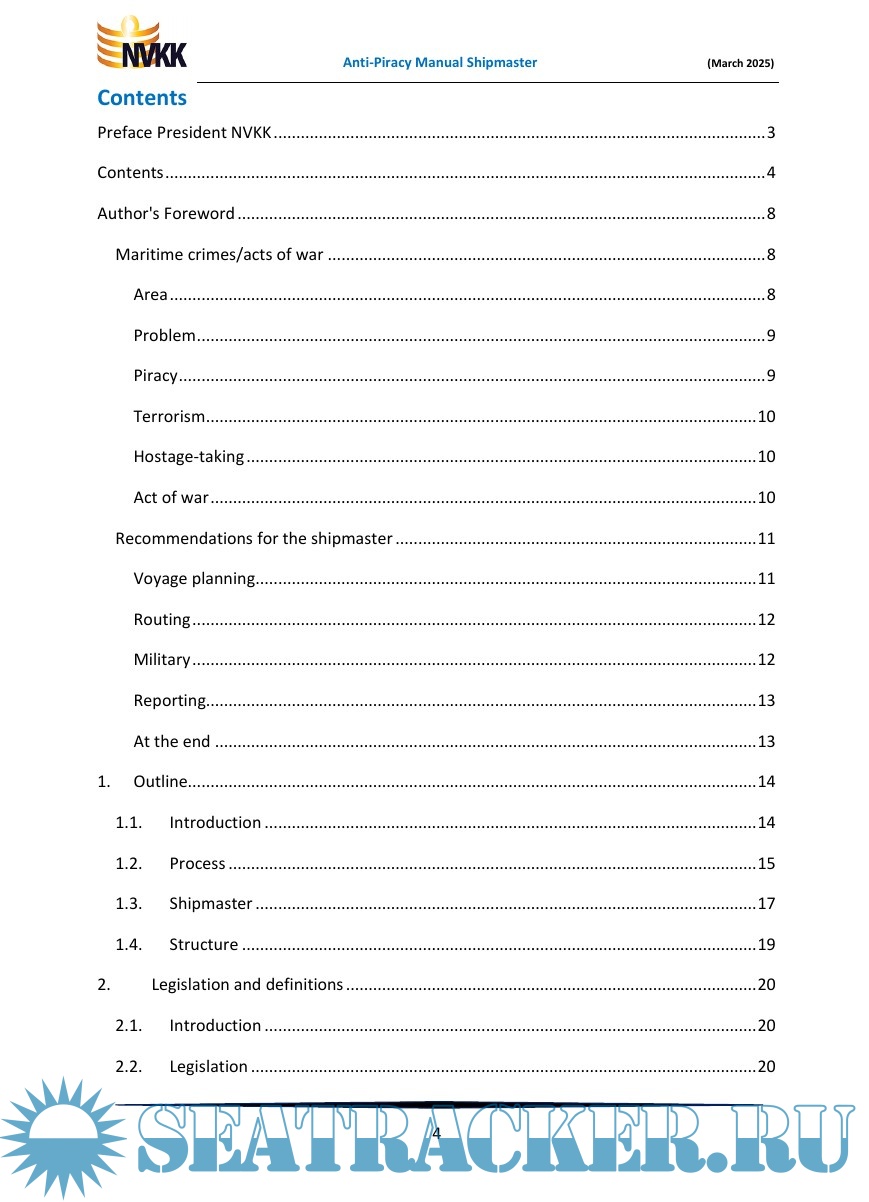 Year: 2025 Language: English Author: Dr. Peter van der Kruit Format: PDF Quality: eBook Pages count: 85 Description: Anti-Piracy Manual for the Shipmaster of a ship flying the flag of the Netherlands. A practical, legal reference work for the Shipmaster to help protect his ship and those on board against pirates in the Gulf of Aden and along a section of the coast of East Africa, in the official Risk Area. This practical Manual, with a large number of uniquely numbered checklists, is intended for masters of ships sailing under the Dutch flag, who may encounter piracy during their voyage. From the preparation of the voyage to the final mandatory travel reports, the shipmaster are guided in their task. The core of this Manual is formed by a number of uniquely numbered checklists to make sure the shipmaster does not forget anything. Furthermore, a number of important subjects are discussed, such as the use of force, notifications and reports, fines, etc. This manual is primarily for the shipmaster, but it is also recommended to all other seafarers and interested parties, such as ship managers, trade unions, educational institutions and the government.