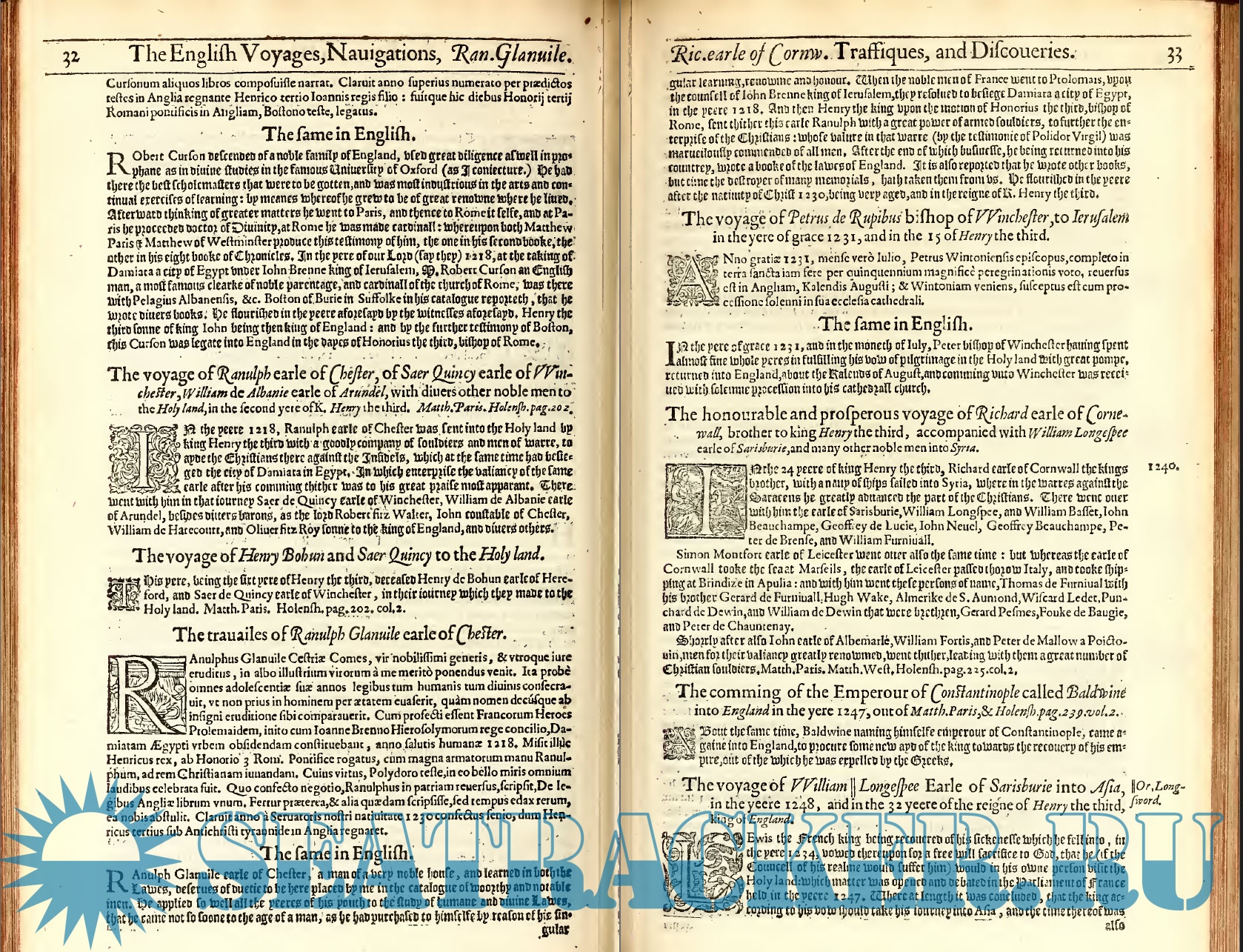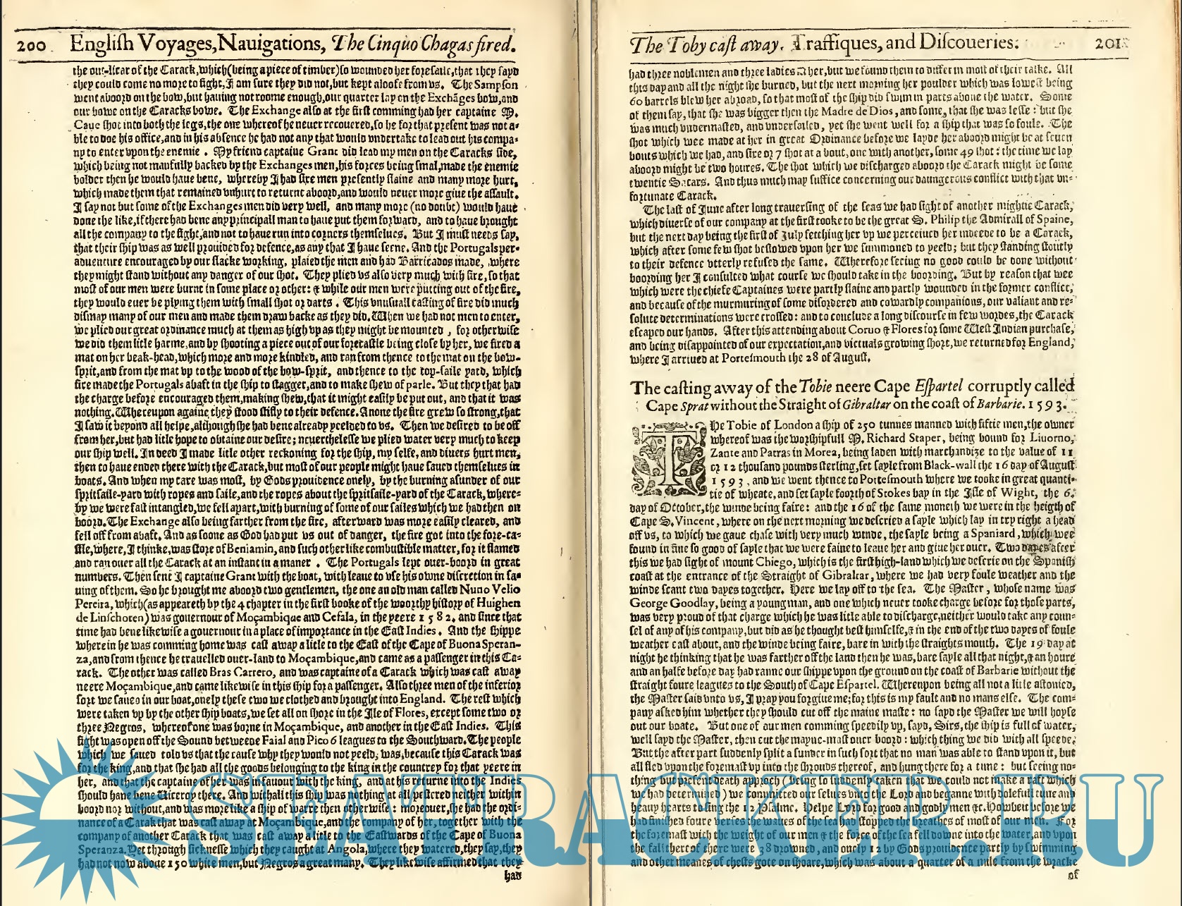 Description: Richard Hakluyt’s monumental work, The Principal Navigations, Voyages, Traffiques and Discoveries of the English Nation, is a comprehensive compilation of English exploration, trade, and maritime history, published in 1598. This extensive collection spans more than 1,600 years of documented sea voyages and land expeditions, focusing on the pioneering journeys made by English navigators to the farthest reaches of the Earth.