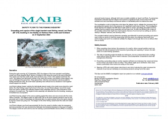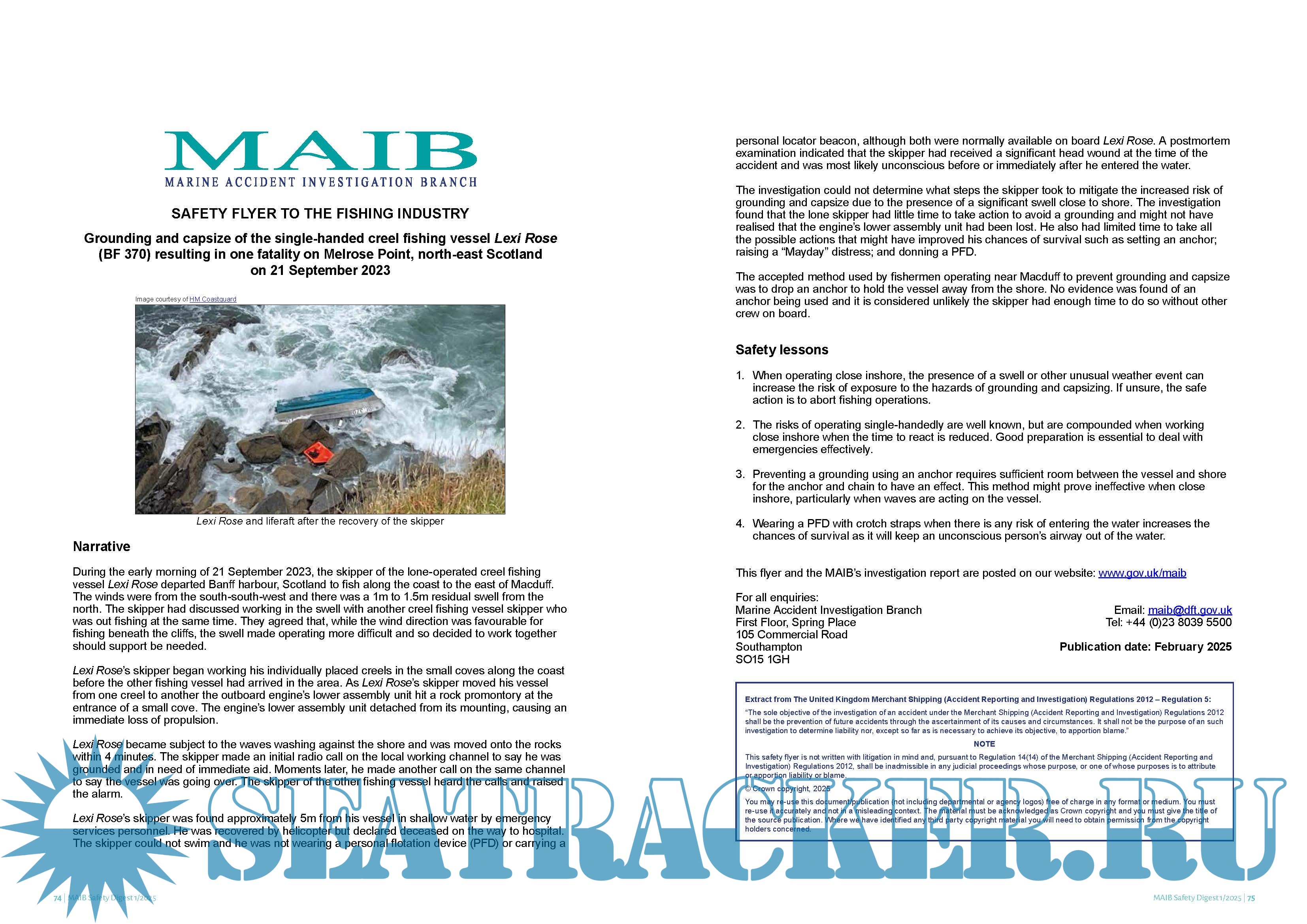 This information is published to inform the merchant and fishing industries, the recreational craft community and the public of the general circumstances of marine accidents and to draw out the lessons to be learned. The sole purpose of the safety digest is to prevent similar accidents happening again. The content must necessarily be regarded as tentative and subject to alteration or correction if additional evidence becomes available.