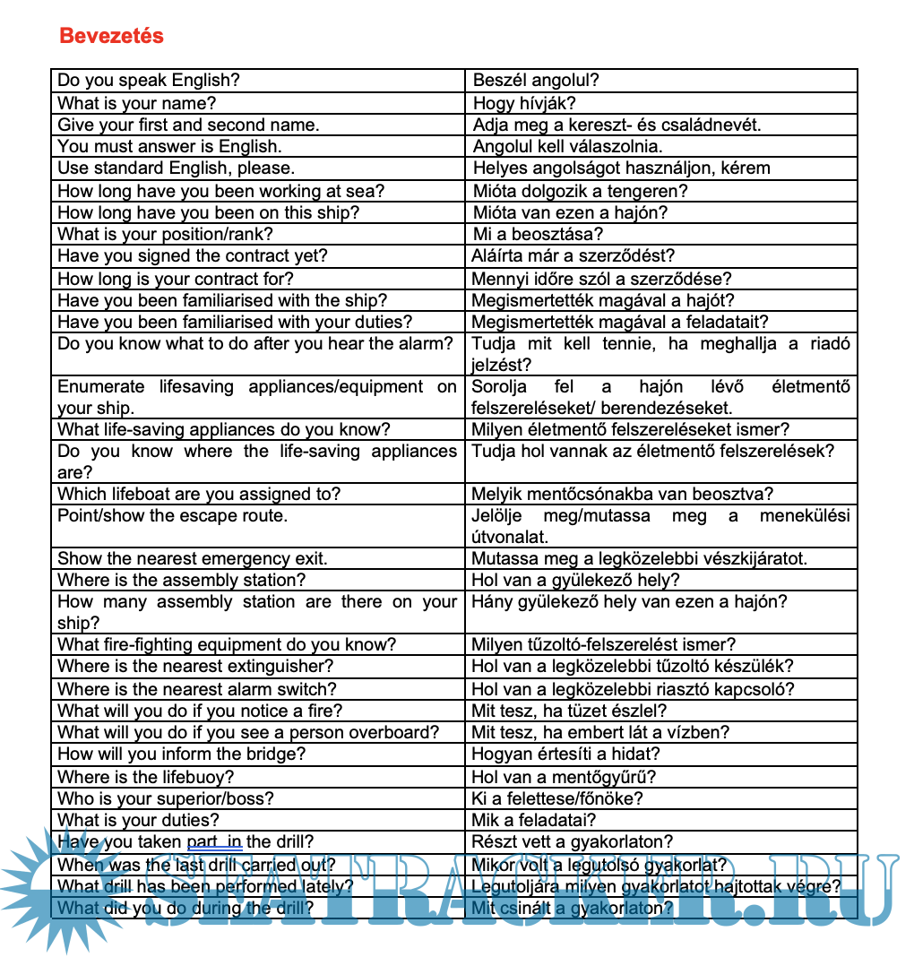 Year: 2015 Language: English, Hungarian Author: Capt Lambert Lajos Format: PDF Quality: Scanned pages Pages count: 33 Description: A collection of English-language maritime terminology on the subject of personal survival techniques, crowd control, fire protection and first aid.