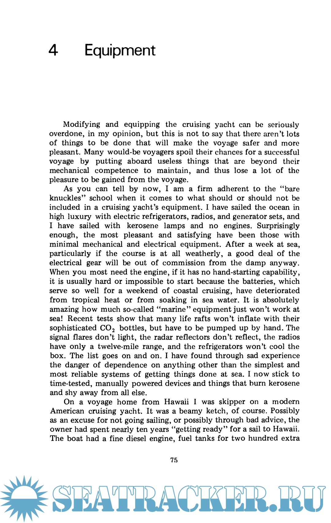 He also has excellent chapters summarizing practical lessons learned on seamanship and navigation. He tells how to plan a voyage and provision ship. On the subject of self-steering, so important to an enjoyable passage, he describes in detail several systems that have proven satisfactory at sea.
