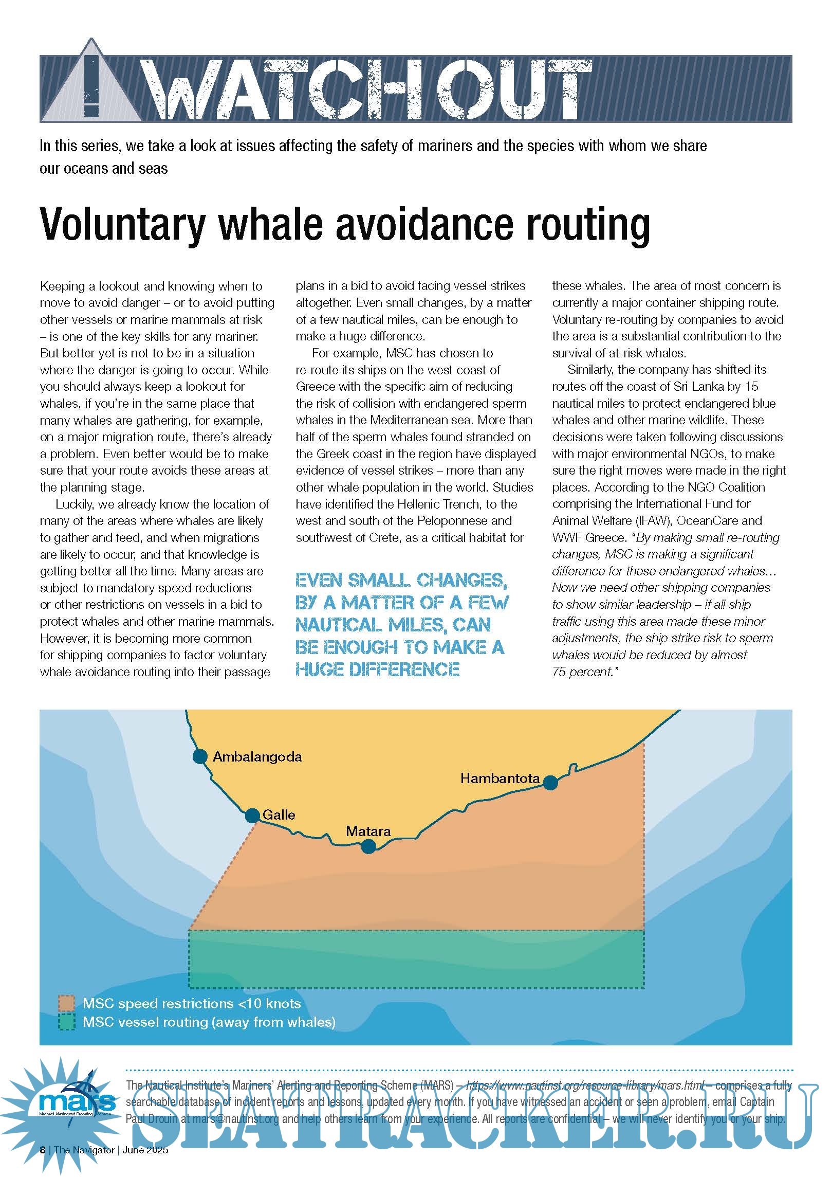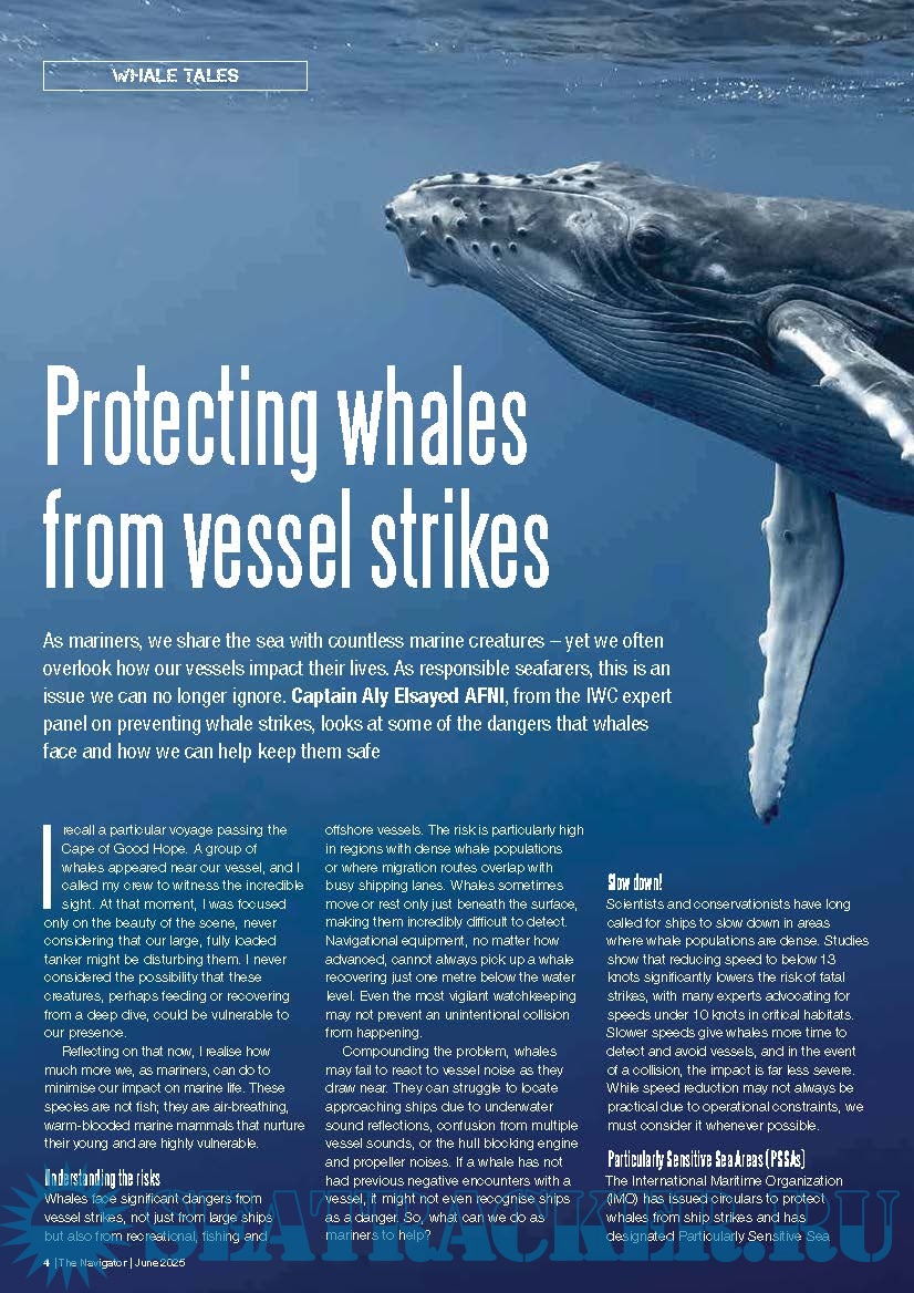 Year: 2025 Language: English Author: Emma Ward (Editor) Genre: Journal, Periodical publication Publisher: The Nautical Institute Edition: Issue no. 39 June, 2025 Format: PDF Quality: eBook Pages count: 12 Description: Inspiring professionalism in marine navigators! The Navigator a publication from The Nautical Institute that champions the role of today's professional marine navigators. Published in association with the Royal Institute of Navigation. In this edition of The Navigator, we focus on detecting, protecting and avoiding whales at sea. Avoiding whale strikes is the collective responsibility of all stakeholders within the shipping industry. According to the IMO and NOAA (National Oceanic and Atmospheric Administration), all sizes and types of ship or vessel, including recreational, commercial and governmental vessels have the potential to collide with nearly all kinds of marine species, including whales. Damage to vessels notwithstanding, the whale will likely come off the worse in the exchange. The increase in the number, size and speed of ships means that the threat of ships striking whale and other marine species is also getting bigger.