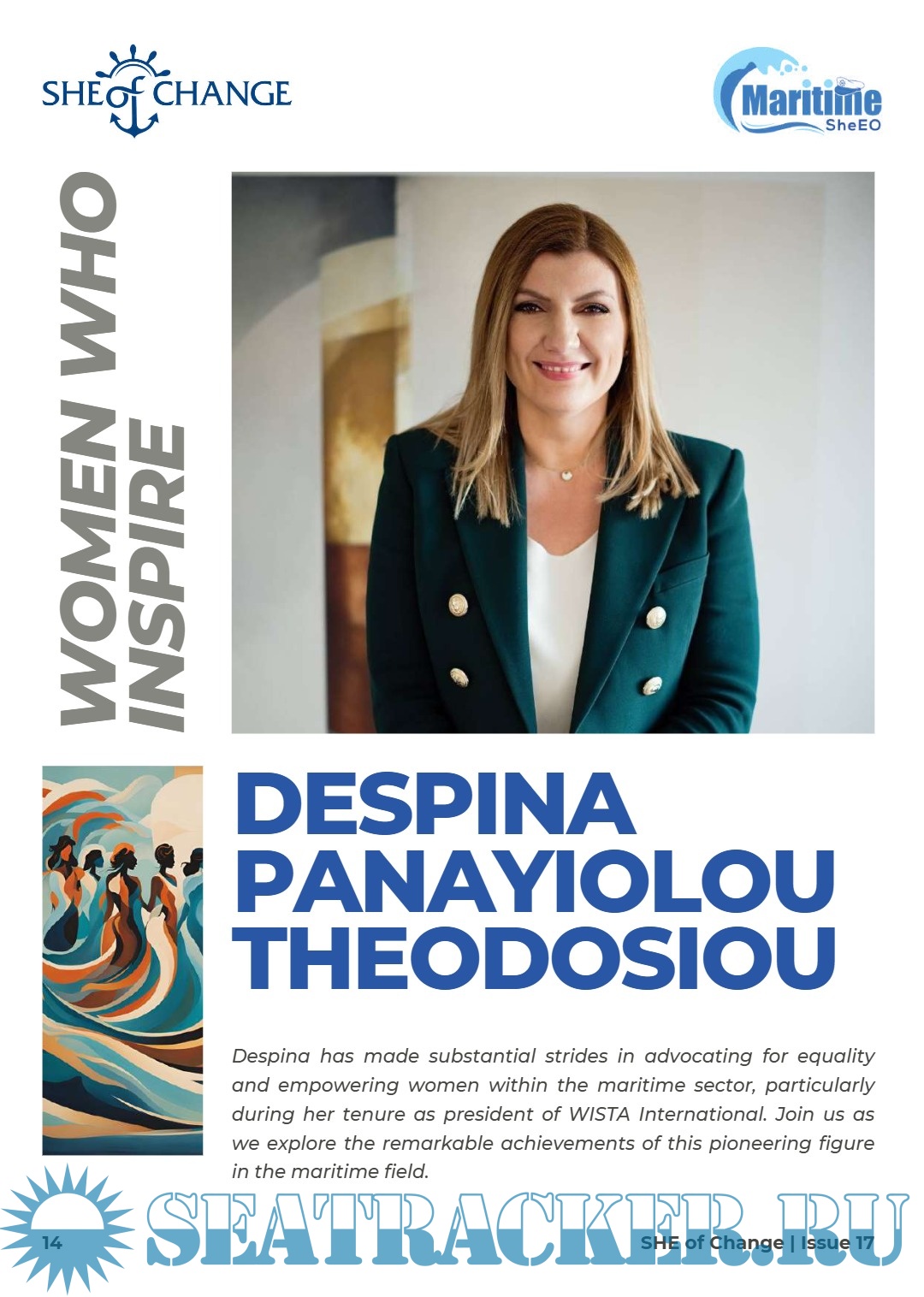 Our feature story presents the remarkable maritime journey of Despina Panayiolou Theodosiou, serving as a beacon of inspiration and encouragement for young women in the maritime industry. We also invite you to read Dr. Li Nancy Lumban Batu’s article discussing the impact of AI in comparison to Human Mentorship. Additionally, we recommend examining a progressive viewpoint on a diverse blue industry shared by Ekta Jha. Furthermore, Dorcas Jonah's transition from the engine room to inspection decks exemplifies a motivating and inspiring journey. Another significant article highlights Angelica Borja, a Maritime SheEO ambassador, who confronts the challenges faced by women in the maritime sector, particularly the pressures to conform to male-dominated standards while advocating for their acceptance and unique growth.