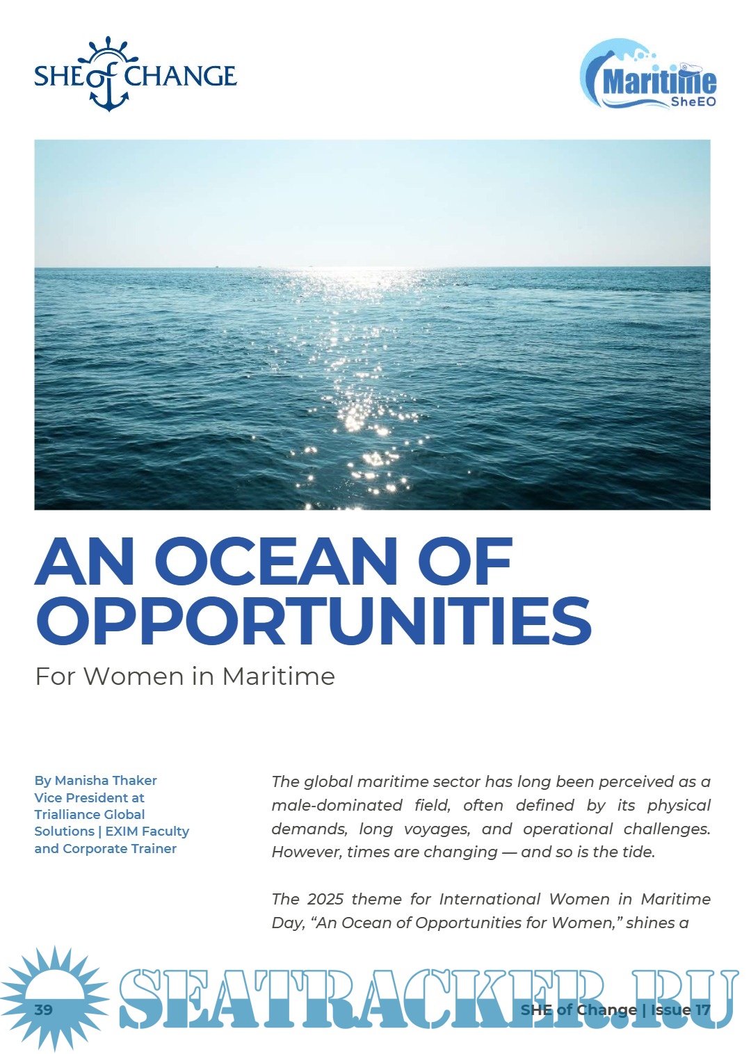 Year: 2025 Language: English Author: Maritime SheEO Genre: Magazine Edition: Issue 17 | May Format: PDF Quality: eBook Pages count: 42 Description: In this issue, we celebrate International Day for Women in Maritime by honoring women who have made remarkable contributions to the maritime industry. Our feature story presents the remarkable maritime journey of Despina Panayiolou Theodosiou, serving as a beacon of inspiration and encouragement for young women in the maritime industry. The issue also includes other uplifting stories of women who have triumphed over challenges, showcasing their achievements that are bound to resonate with you. Our feature story presents the remarkable maritime journey of Despina Panayiolou Theodosiou, serving as a beacon of inspiration and encouragement for young women in the maritime industry. We also invite you to read Dr. Li Nancy Lumban Batu’s article discussing the impact of AI in comparison to Human Mentorship. Additionally, we recommend examining a progressive viewpoint on a diverse blue industry shared by Ekta Jha. Furthermore, Dorcas Jonah's transition from the engine room to inspection decks exemplifies a motivating and inspiring journey. Another significant article highlights Angelica Borja, a Maritime SheEO ambassador, who confronts the challenges faced by women in the maritime sector, particularly the pressures to conform to male-dominated standards while advocating for their acceptance and unique growth. Also an article written by Manisha Thaker explores "An Ocean of Opportunities for Women in Maritime," offering valuable insights into the career options available to them. It is certainly a worthwhile read. Last but not least, we have included other uplifting stories of women who have triumphed over challenges, showcasing their achievements that are bound to resonate with you. Additional info: About the Founder: Maritime SheEO is the brainchild of our founder Sanjam. An advocate for Diversity in the Maritime Industry, she is the “go to” person for gender issues in the Indian maritime industry as well as overseas. Passionate about driving change, she launched Maritime SheEO in August 2019.She has been working in the maritime industry since 2001 and is a Director of Sitara Shipping Ltd.A founder member of Women’s International Shipping and Trading Association (WISTA) India, she is also currently Exco member of WISTA International. She’s a member of the Executive Board of Directors of the World Maritime University based in Malmo, Sweden.