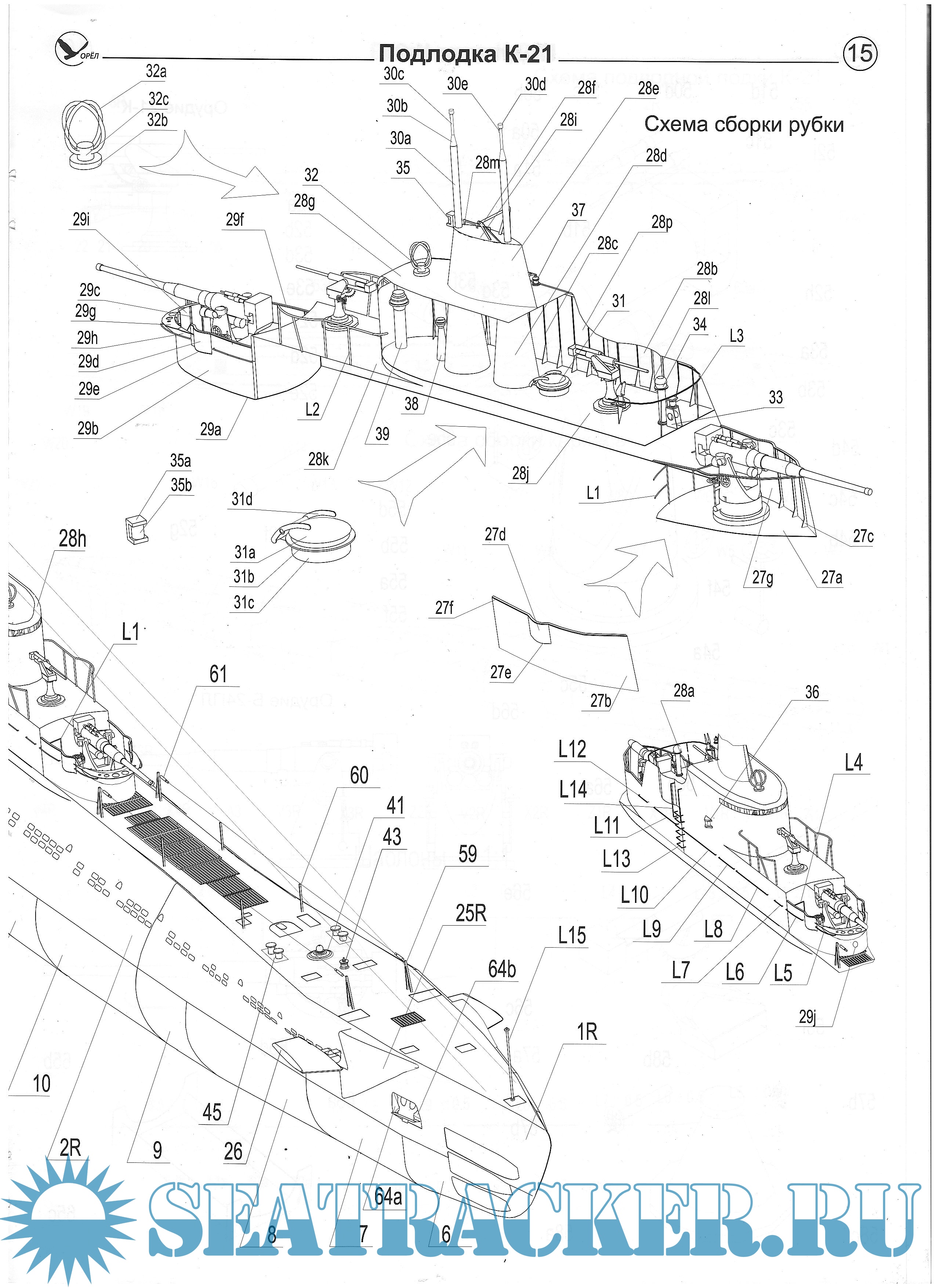 22 листа цветных выкроек и инструкций для изготовления бумажной модели подводной лодки K-21 год в масштабе 1:100