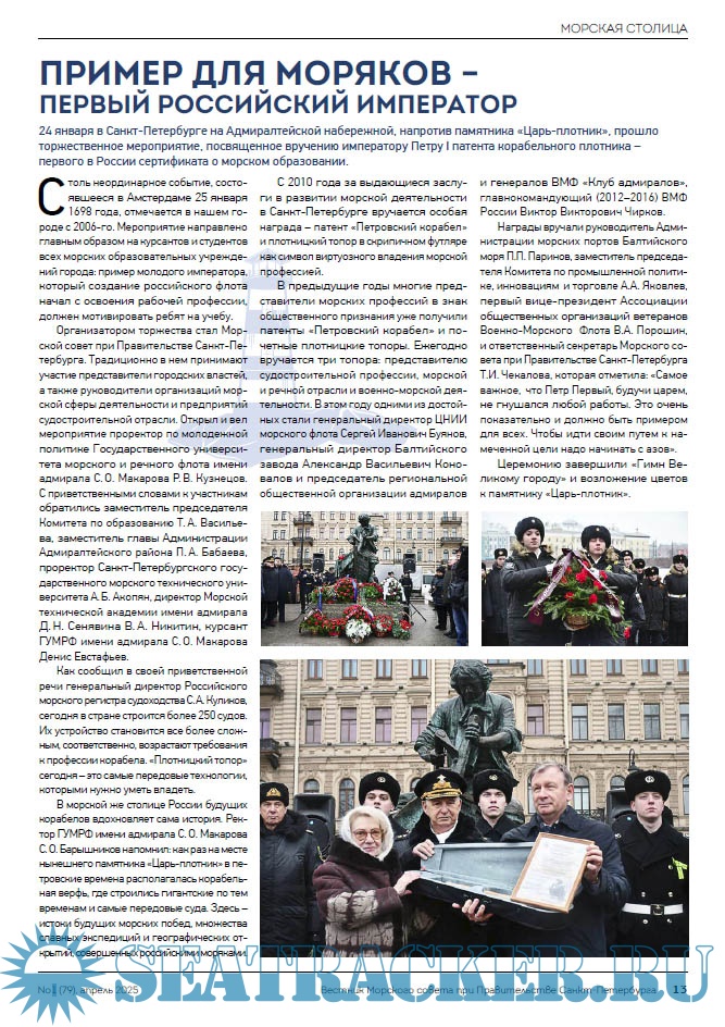 Описание: Целью информационного печатного издания является информационное освещение всех направлений морской деятельности Санкт-Петербурга: морской и речной транспортной деятельности, военно-морской деятельности, деятельности по эксплуатации портовой инфраструктуры, судостроения, деятельности по обеспечению экологической безопасности морского и речного судоходства, морского образования и науки, морского и речного туризма, парусного спорта и маломерного флота, деятельности по изучению, освоению и использованию Мирового океана и многое другое.