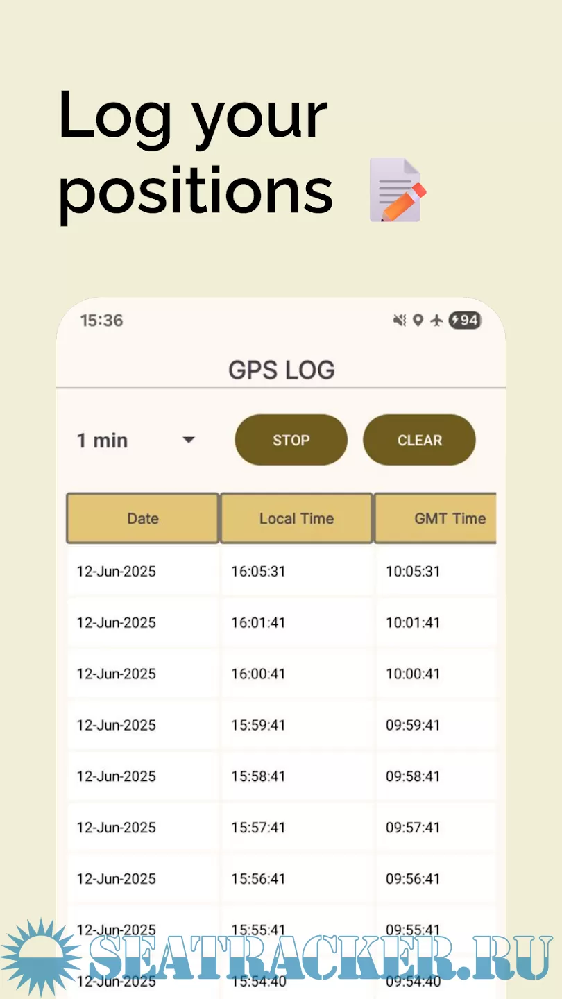 • Auto-logging of GPS position and timestamps (local + GMT)