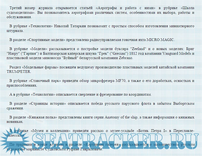Описание: Журнал «Верфь моделиста» выходит в электронном формате со свободным бесплатным распространением. Журнал ориентирован в первую очередь на начинающих моделистов, но надеемся и более опытные смогут найти для себя интересную информацию.