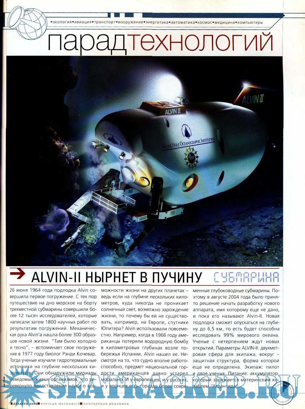Тематика статей — история, техника (роботы, электроника, компьютеры, транспорт, нанотехнологии, энергетика, технологии в архитектуре, стенобитные орудия, современная бытовая техника, оригинальные изобретения, и т. д.), астрономия (космология, космонавтика, планетология, и т. д.), физика, химия, биология, оружие, морские технологии и новости судостроения.