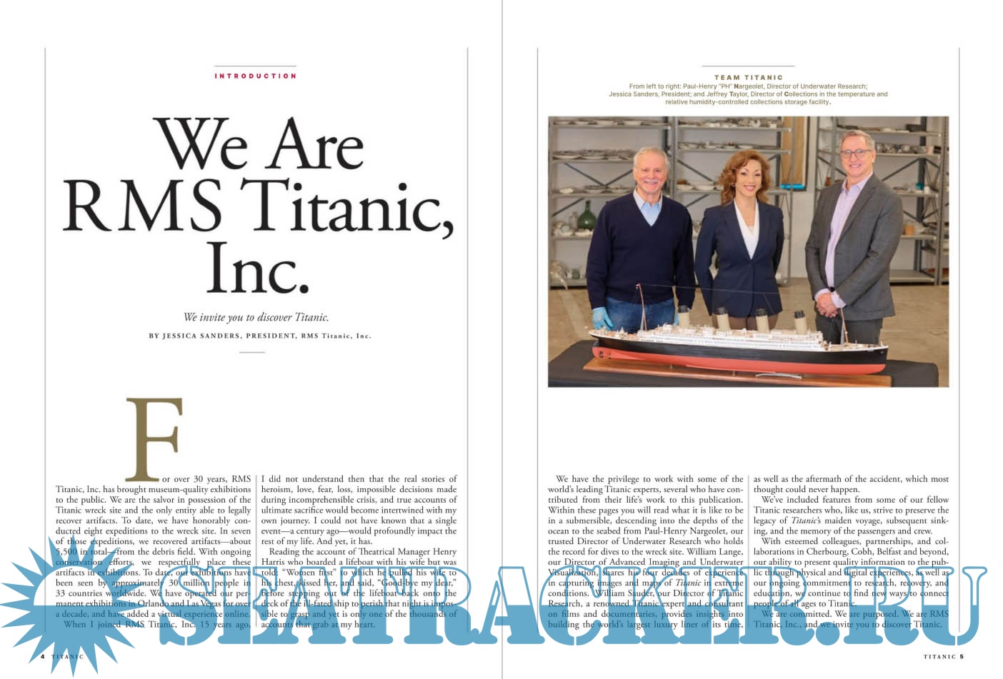 Description: For over 30 years, RMS Titanic, Inc. has brought museum-quality exhibitions to the public. We are the salvor in possession of the Titanic wreck site and the only entity able to legally recover artifacts. We have the privilege to work with some of the world’s leading Titanic experts, several who have contributed from their life’s work to this publication. We’ve included features from some of our fellow researchers who, like us, strive to preserve the legacy of Titanic’s maiden voyage, subsequent sinking, and the memory of the passengers and crew.