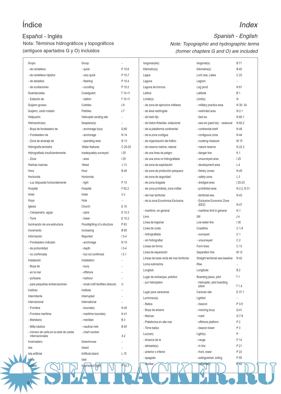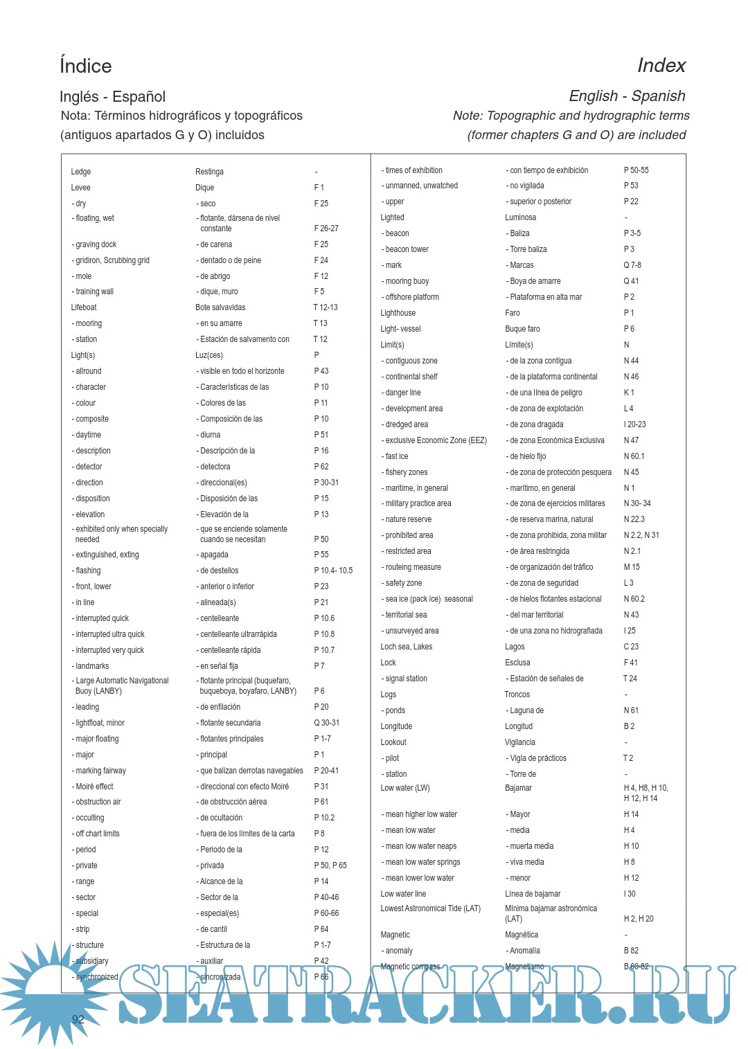 Year: 2011 Language: English, Spanish Author: Instituto Hidrográfico de la Marina Genre: Atlas Publisher: Instituto Hidrográfico de la Marina Format: PDF Quality: eBook Pages count: 104 Description: This edition of Symbols, Abbreviations and Terms used on charts is based upon the “Chart specifications of the IHO” (IHO: International Hydrographic Organization), which came into force at the XIIth International Hydrographic Conference 1982 in Monaco. This publication also shows number INT 1, as being the official publication of the IHO in Spanish language on this topic. This publication contains the complete symbols, abbreviations and terms used on paper charts published by Instituto Hidrográfico de la Marina (IHM). This ublication applies to printed charts. Symbols and abbreviations shown on navigational display systems using electronic charts may sometimes differ from those described in this document. All New Editions published by IHM are based upon international specifications. Charts based upon older specifications will be gradually replaced. In nautical documents in force, the numbers of the symbols and abbreviations referred in INT 1 may still be prefixed with the letter “I” for International (e.g. IK 28 instead of K28).