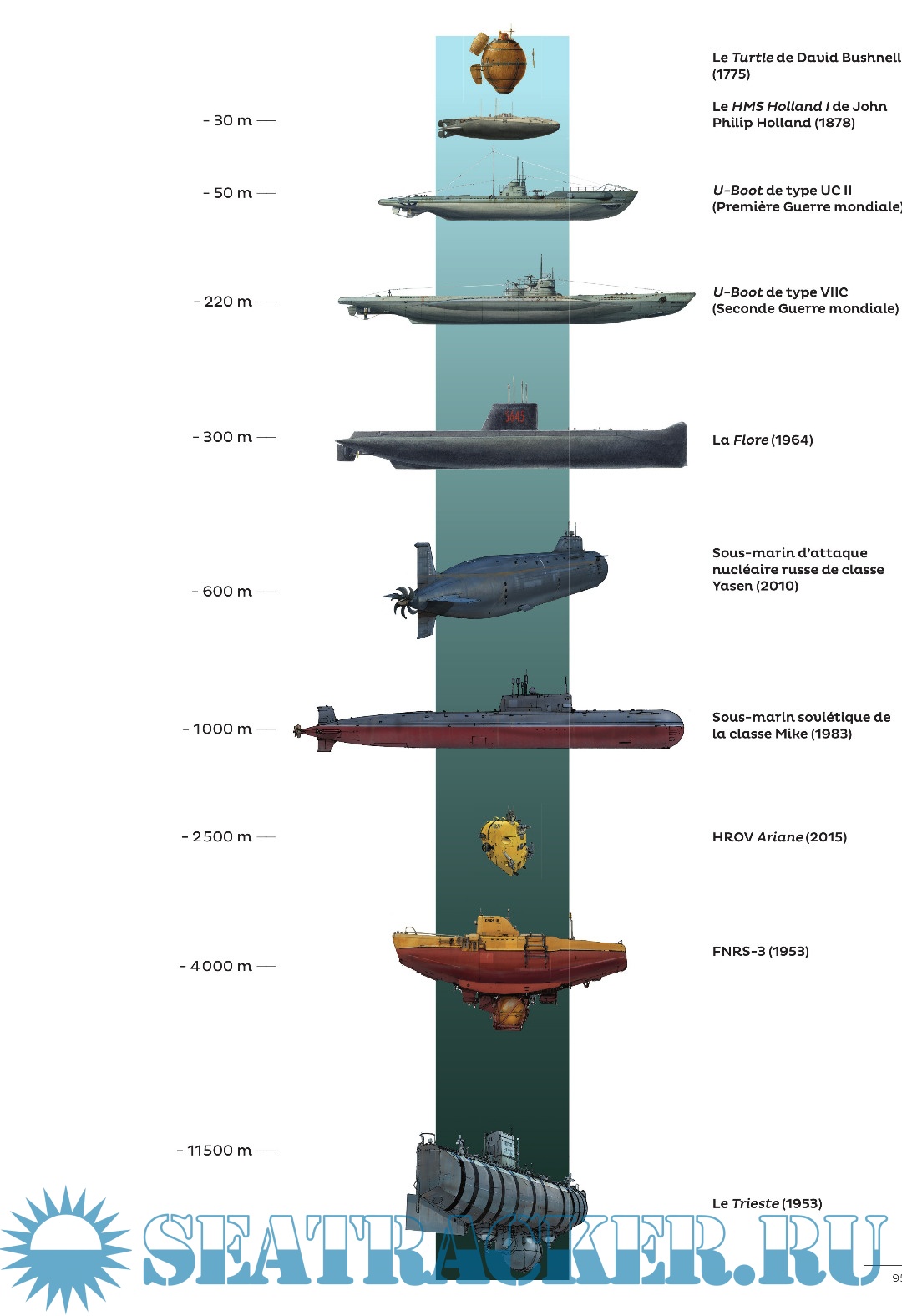 Но история подводных лодок не только военная, но и научная, связанная с исследованием морского дна. Хотя суша уже не таит в себе много сюрпризов, подводные глубины отчасти остаются Terra Incognita, или, скорее, Mare Incognita. На борту своего батискафа «Триест» Огюст Пиккар в 1960 году успешно спустился в Марианскую впадину, самую глубокую в мире (более 10 900 м).