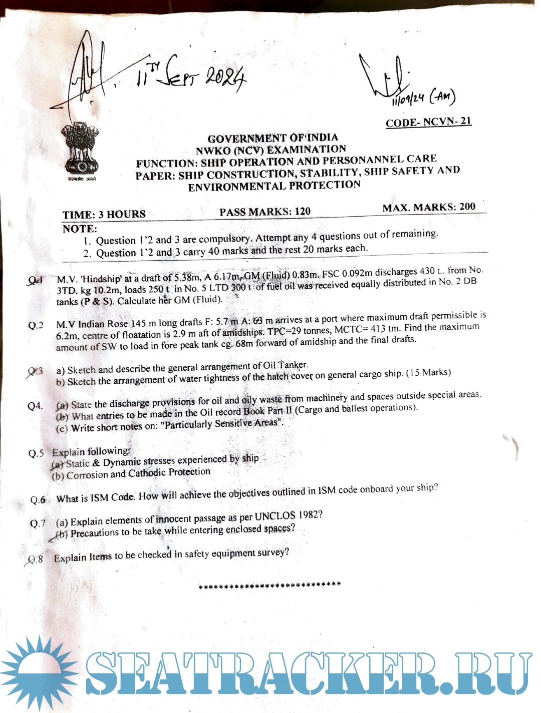 Question Paper Set (September 2024) for NWKO (NCV) Mercantile Marine Department (MMD), India Examinations