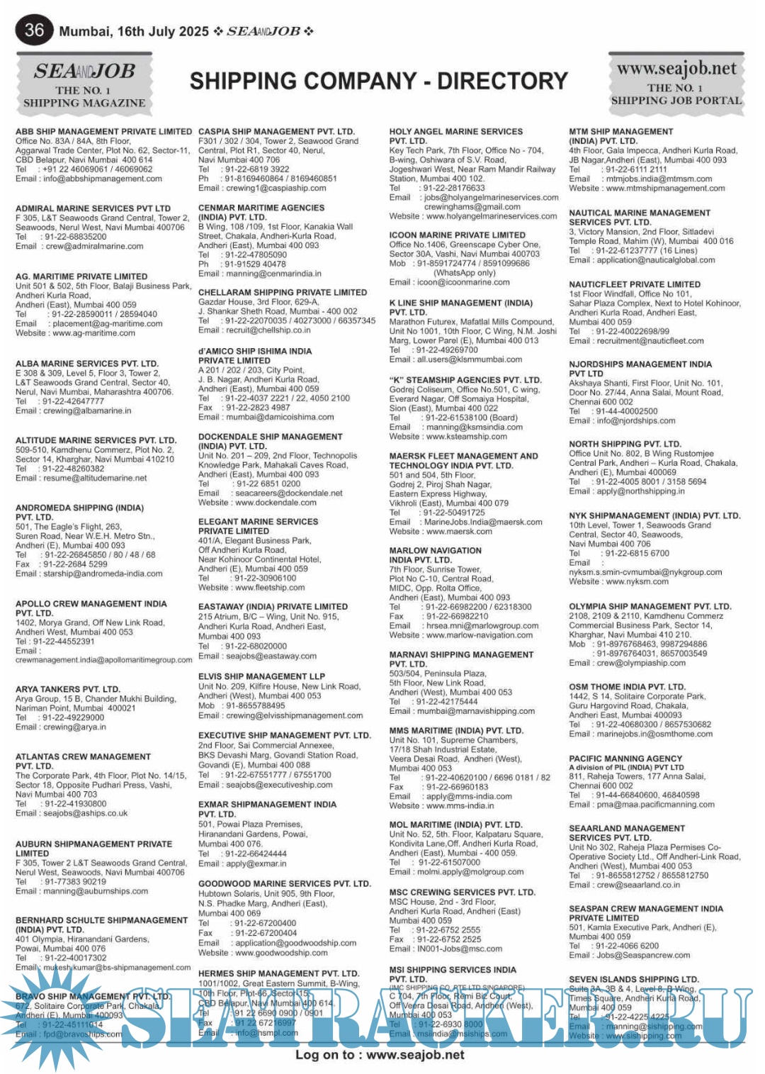 Description: The Sea and Job magazine launched in May 2007, was the second venture of Sea Line Group succeeding 'seajob.net' bringing the much renowned essence to the Group, the Sea and Job Magazine quickly gained popularity, becoming the No. 1 Shipping Magazine that came to be widely circulated all over India.Sea and Job over the years has evolved as the most trusted, ethical, objective and read maritime publication that possesses a large database of subscribers from various verticals in the industry.The magazine provides informative and interesting articles covering not just the shipping world but also the world outside it. Sea and Job is also a medium for the shipping/ manning companies to advertise marine jobs and also to promote their organization by publicizing internal activities like seminars, sports events and parties.Some notable endeavors of the magazine include the Know Your Recruiter Column, the Sailing Episodes Column and the Marine Insights section. The consistent efforts and the dedication to provide extraordinary services to the industry has resulted in the magnifying popularity and patronage of Sea and Job.