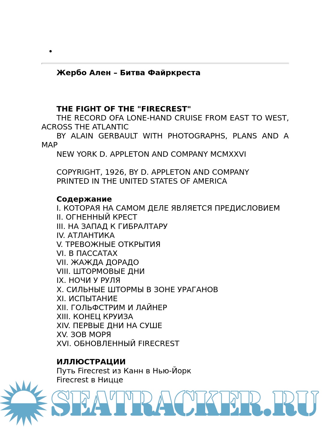 Описание: Ален Жербо (1893-1941) французский моряк, писатель и чемпион по теннису, совершивший кругосветное плавание в одиночку. В конце концов он осел на островах южной части Тихого океана, где написал несколько книг об образе жизни островитян. В книге «The fight of the Firecrest» (Битва Файркреста) он описывает своё одиночное плавание через Атлантику на яхте «Файркрест» из Гибралтара в Нью-Йорк в 1923 году за 101 день.