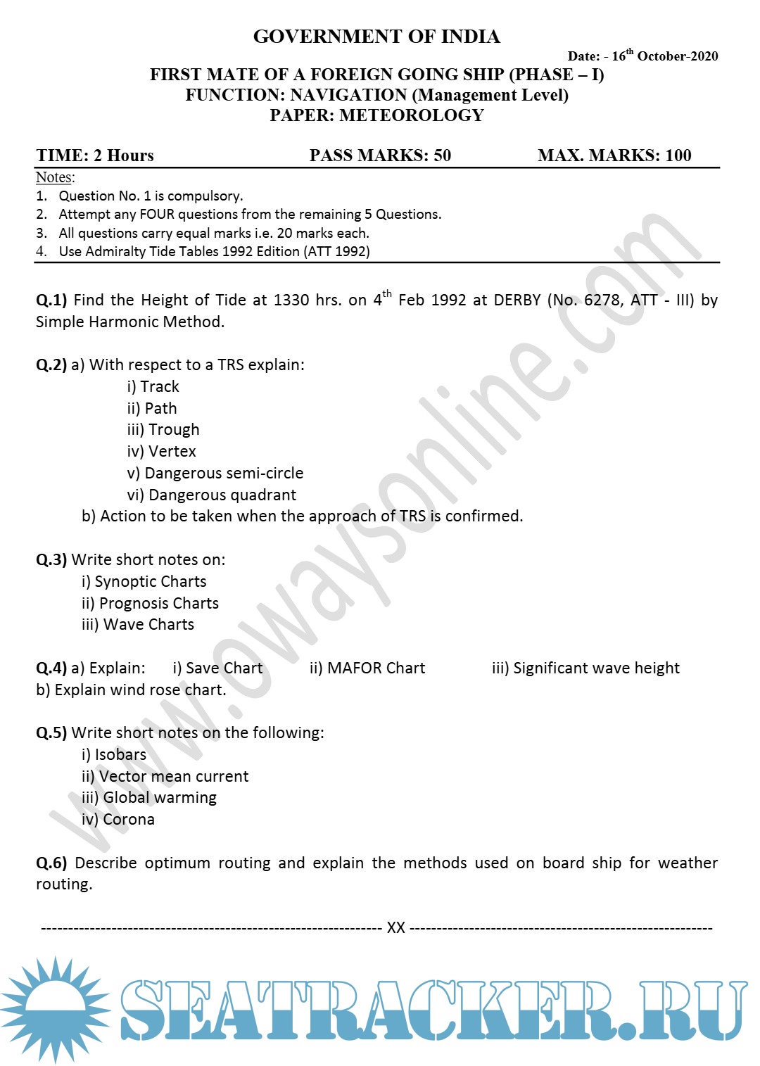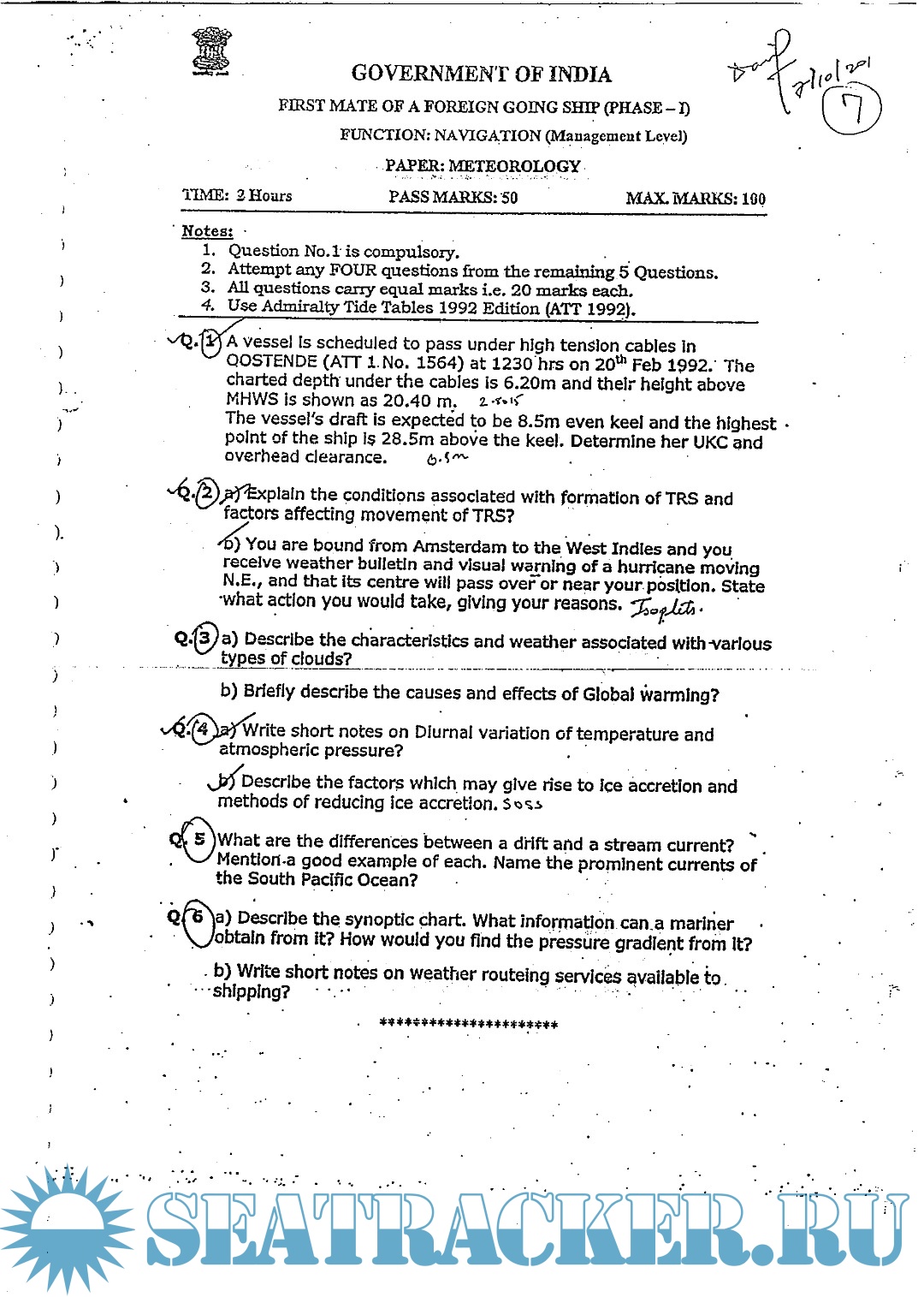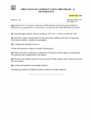 Description: Question paper set for Meteorology Mercantile Marine Department (MMD), India Exams for Phase I - Chief Mate (F.G.).