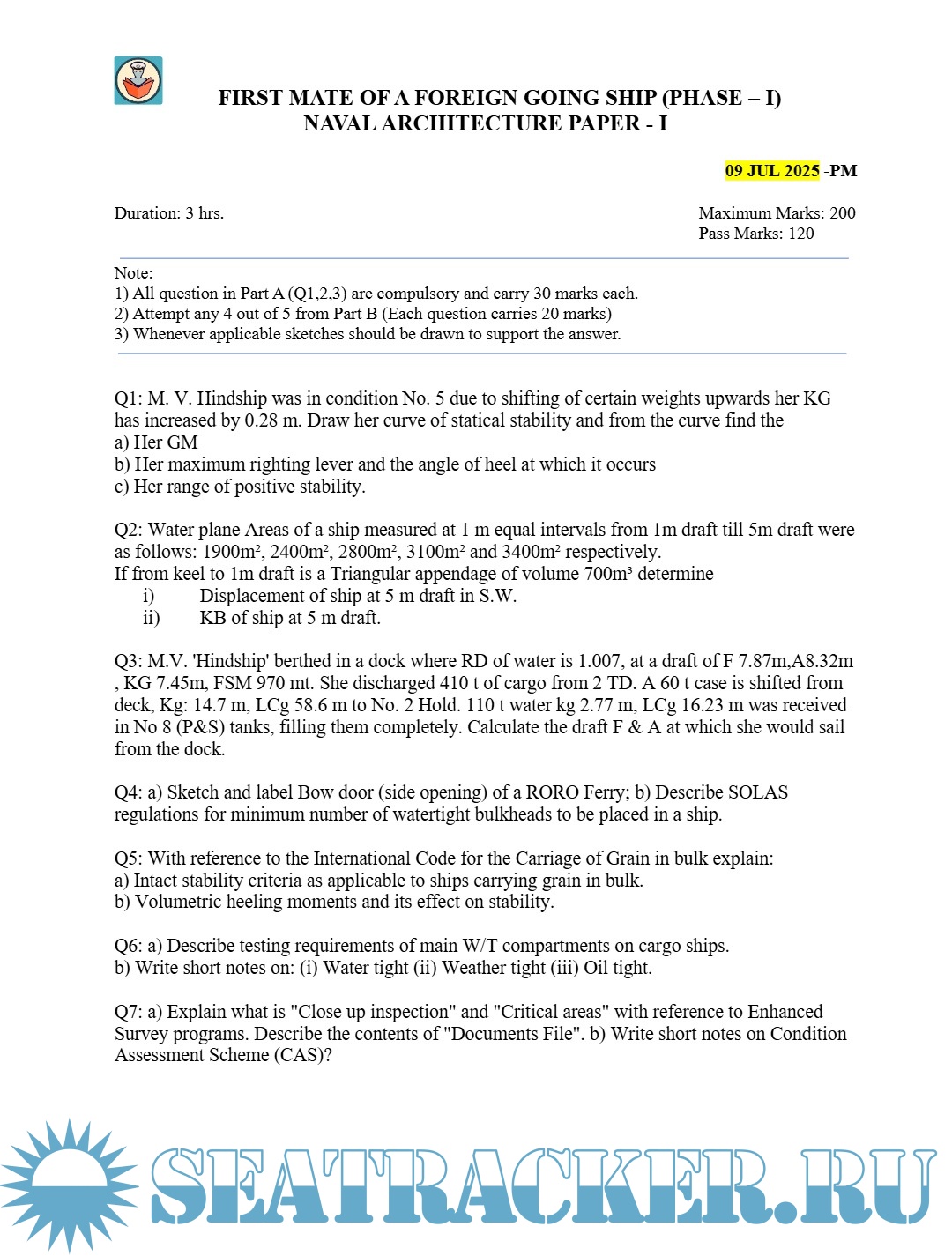 Question Paper Set Naval Architecture I (July 2025) Phase I (Chief Mate F.G.) Mercantile Marine Department (MMD), India Examinations