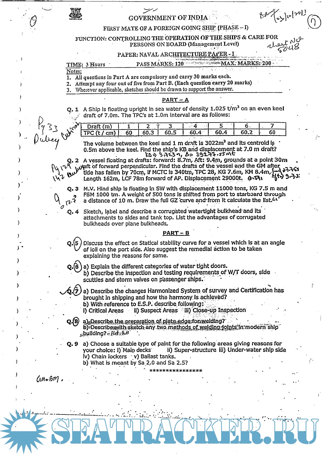 Description: Question paper set for Naval Architecture-I Mercantile Marine Department (MMD), India Exams for Phase I - Chief Mate (F.G.).
