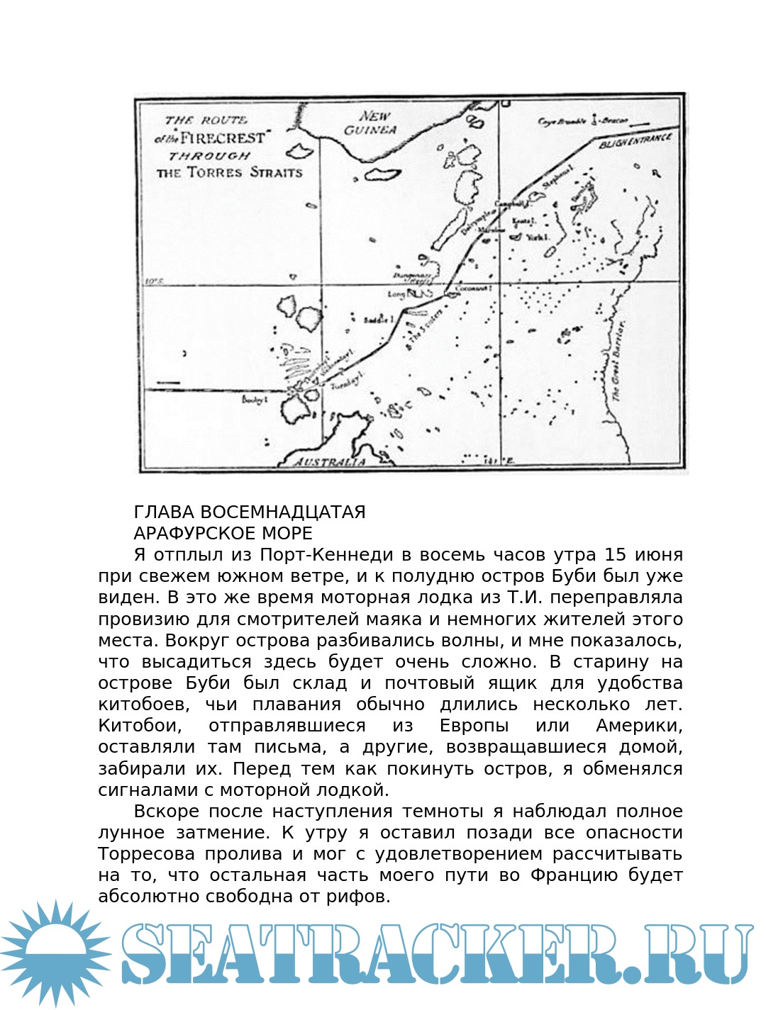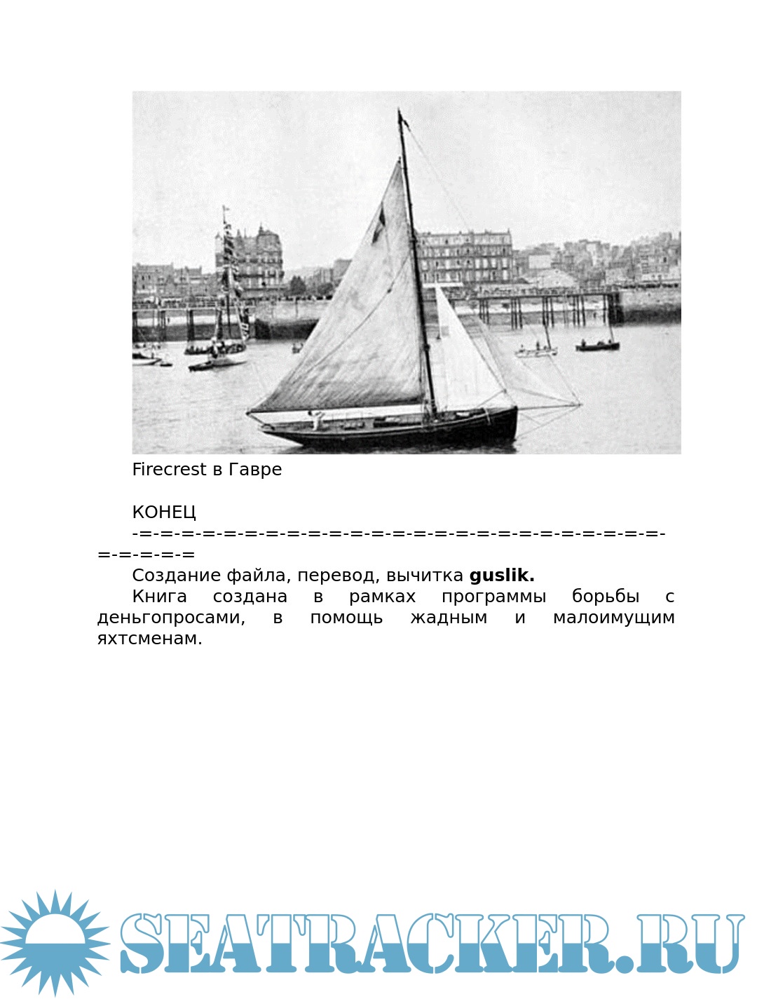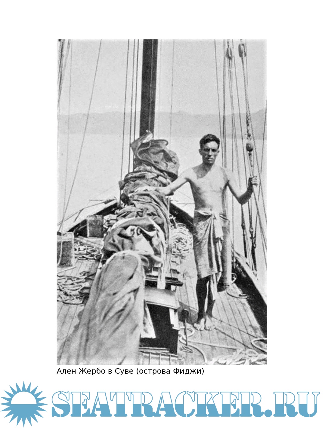 Описание: Ален Жербо (1893-1941) французский моряк, писатель и чемпион по теннису, совершивший кругосветное плавание в одиночку. В конце концов он осел на островах южной части Тихого океана, где написал несколько книг об образе жизни островитян. В книге «In quest of the sun» (В поисках солнца) описывается дальнейшее кругосветное одиночное плавание автора на яхте «Файркрест» из Нью-Йорка через Панамский канал, Тихий океан и Полинезию, Арафурское море, Индийский океан, мыс Доброй Надежды и Атлантику в Гавр (Франция) в 1924 - 1929 годах. Всего в этом плавании было проведено 700 дней в море и пройдено более 40000 миль.
